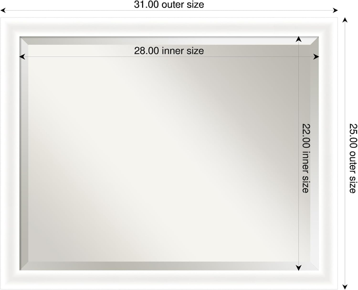 - MIRROR DETAILS: This mirror features premium glass for a clear, undistorted image and is finished with a beveled edge to give the glass a decorative touch. The overall size of this bathroom mirror measures exactly 31 x 25 inches, including the frame. Its reflective area measures 28 x 22 inches.