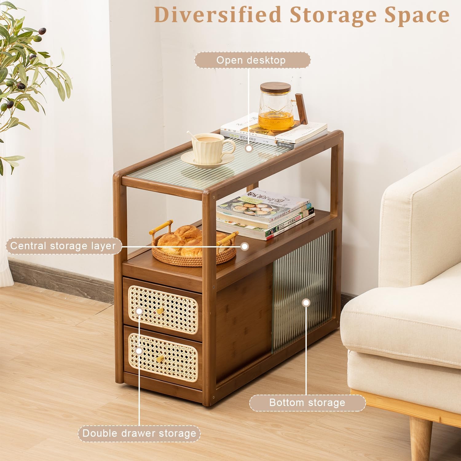 Bamboo Side Table Nightstand with Rattan Drawer & Glass Top – Multi-Function End Table, Nightstands with Storage for Bedroom, Living Room, and Small Spaces, Walnut