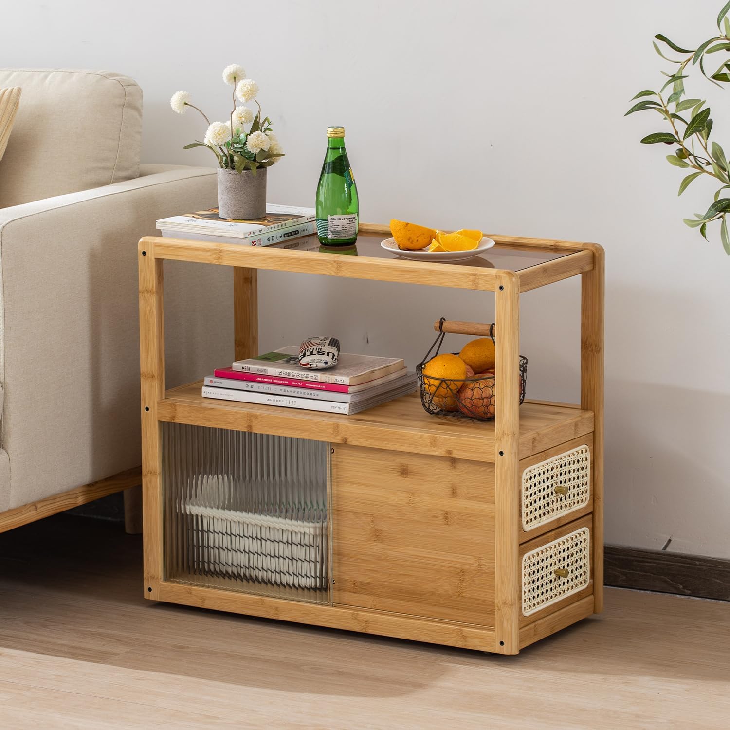 - 【Natural & Modern Material Mix】Crafted from sustainable bamboo with a handwoven rattan drawer front, this versatile piece is topped with textured fluted glass—offering both durability and soft visual appeal while maintaining a light, airy presence.