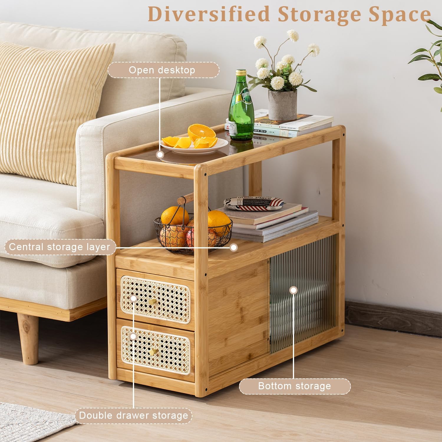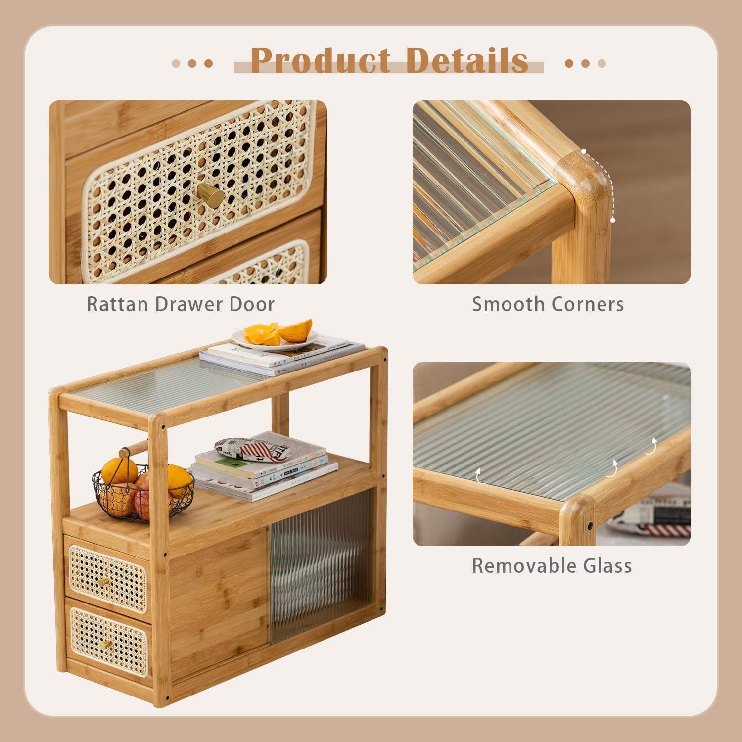- 【Family-Safe & Sturdy Structure】Features rounded corners, a smooth finish, and reinforced bamboo frame for added safety. The fluted glass top is scratch-resistant and easy to clean, offering peace of mind in homes with children or pets.