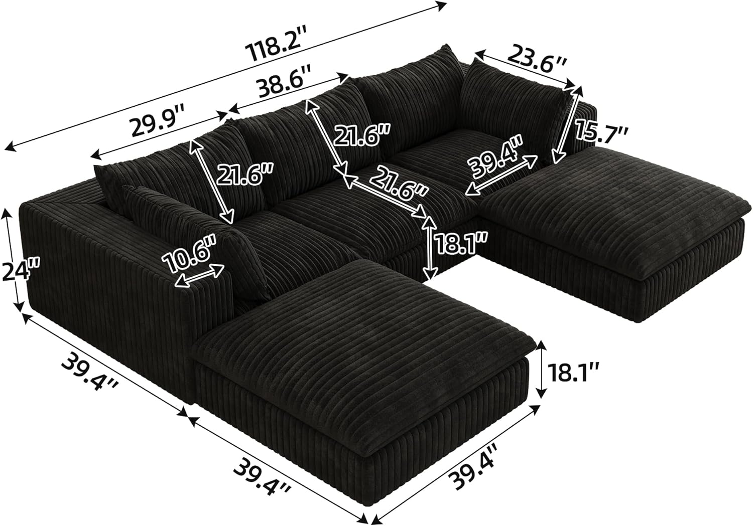 Down Filled Boneless Sectional Sofa Cloud Couch with Movable Ottomans, 118 inch Convertible U Shaped Lounge Couch w/Deep Seat, Fluffy Corduroy Upholstered Compress Modular Sofa