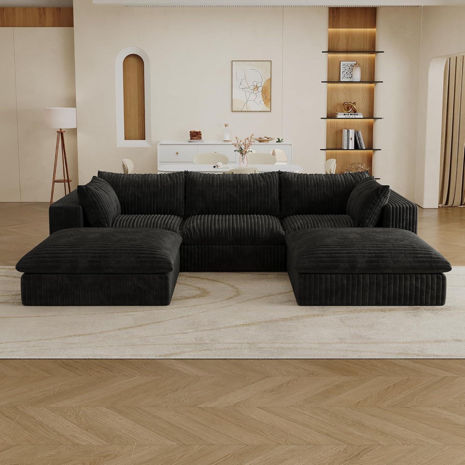 - Fluffy Corduroy Sectional Sofa with Ottoman : This sofa is crafted from a soft, skin-friendly corduroy fabric that feels as light as clouds and exudes a luxurious appearance.Its warm touch ensures comfort throughout the year. The unique striped pattern and gentle sheen enhance the tactile experience, elevating the sensory experience to new heights. It seamlessly blends comfort with visual appeal, creating a cohesive and harmonious space.