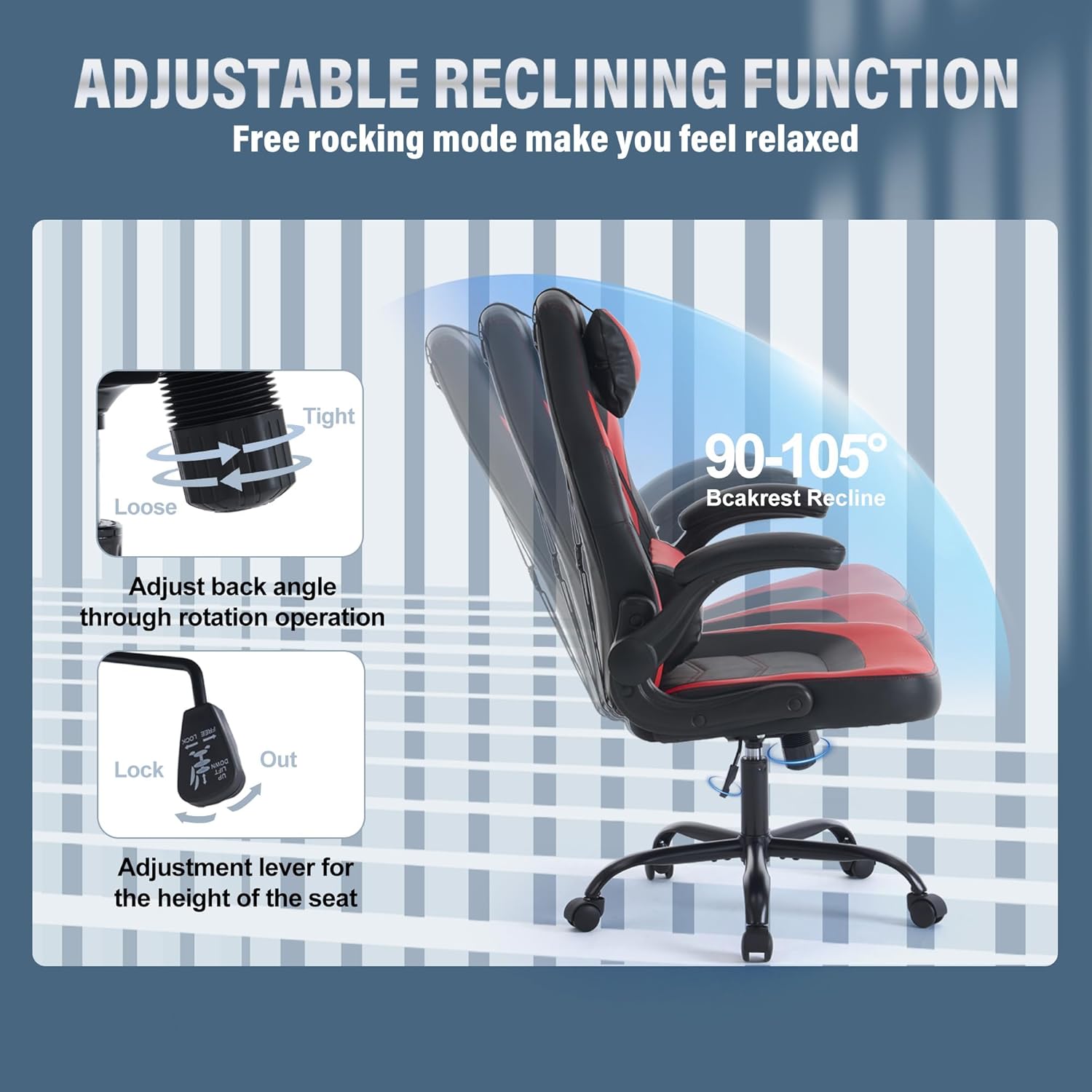 - Multi-functional adjustable - This product is equipped with detachable headrest and lumbar support. The lumbar support can be adjusted by sliding to position that suits your sitting posture, making it ideal for entertainment and work time. The back angle can be adjusted from 90° for concentration to 105° for relaxation. The sturdy three-level air pressure lifting device and upgraded mechanism ensure stable and powerful support at any angle, providing reliable support in any position.