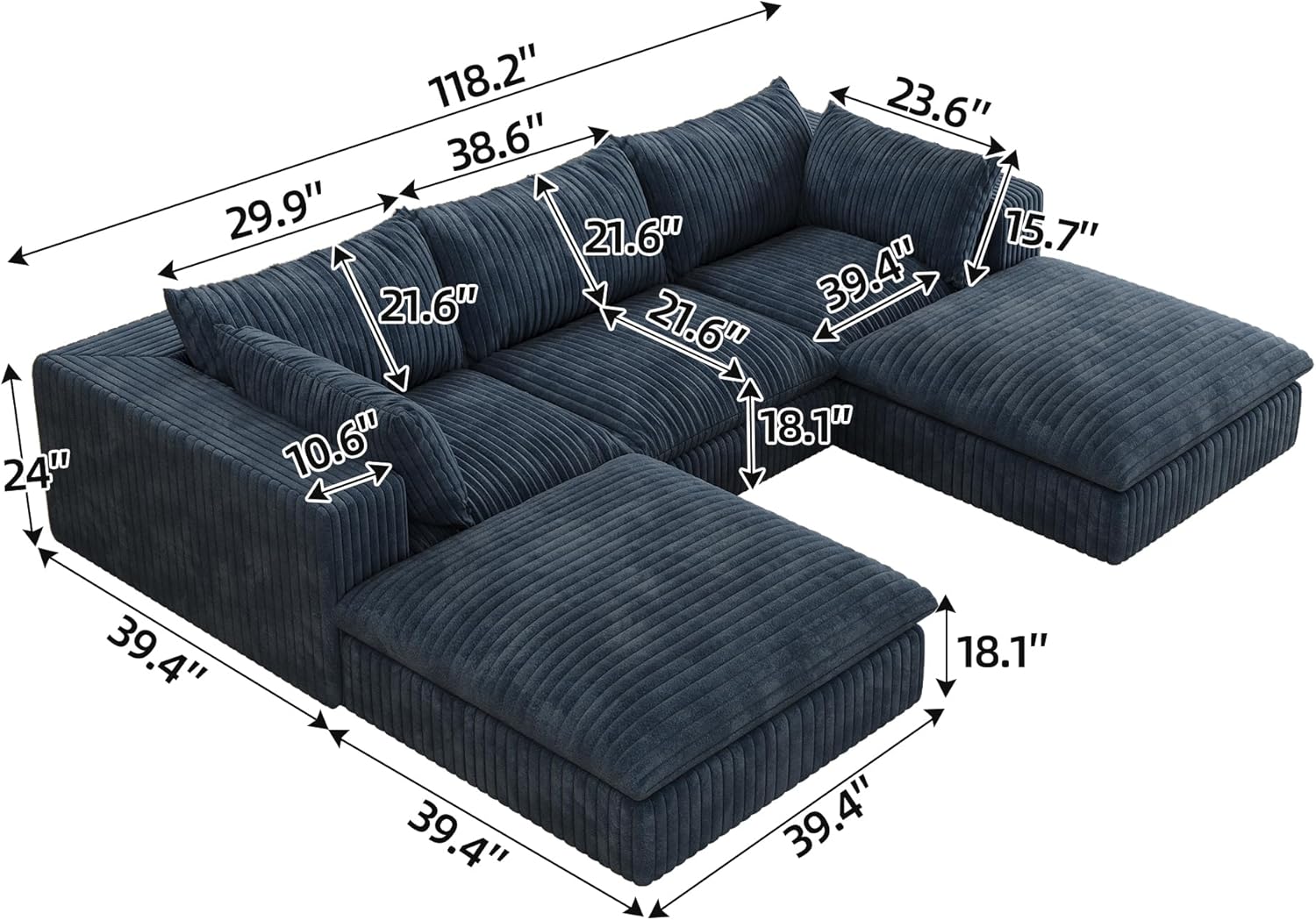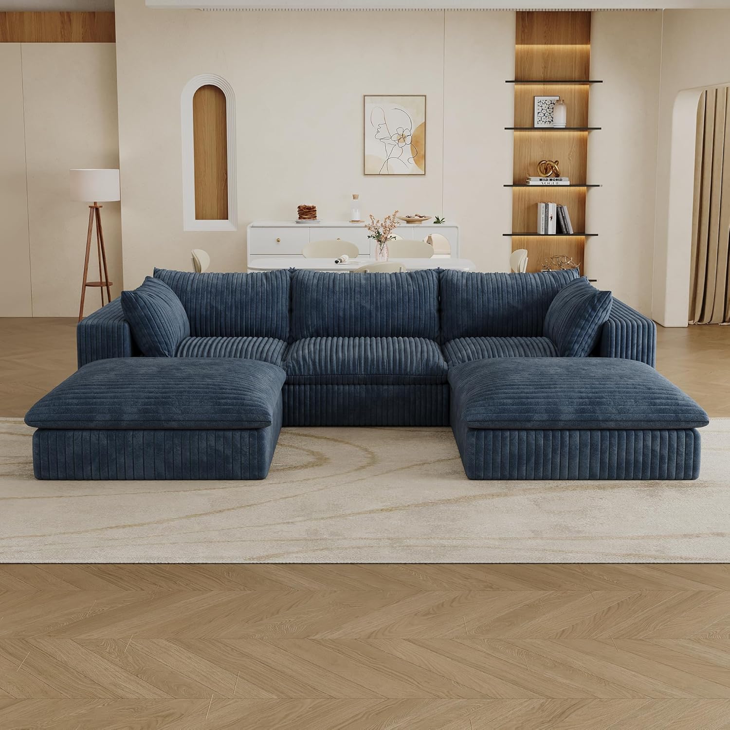 - Fluffy Corduroy Sectional Sofa with Ottoman : This sofa is crafted from a soft, skin-friendly corduroy fabric that feels as light as clouds and exudes a luxurious appearance.Its warm touch ensures comfort throughout the year. The unique striped pattern and gentle sheen enhance the tactile experience, elevating the sensory experience to new heights. It seamlessly blends comfort with visual appeal, creating a cohesive and harmonious space.