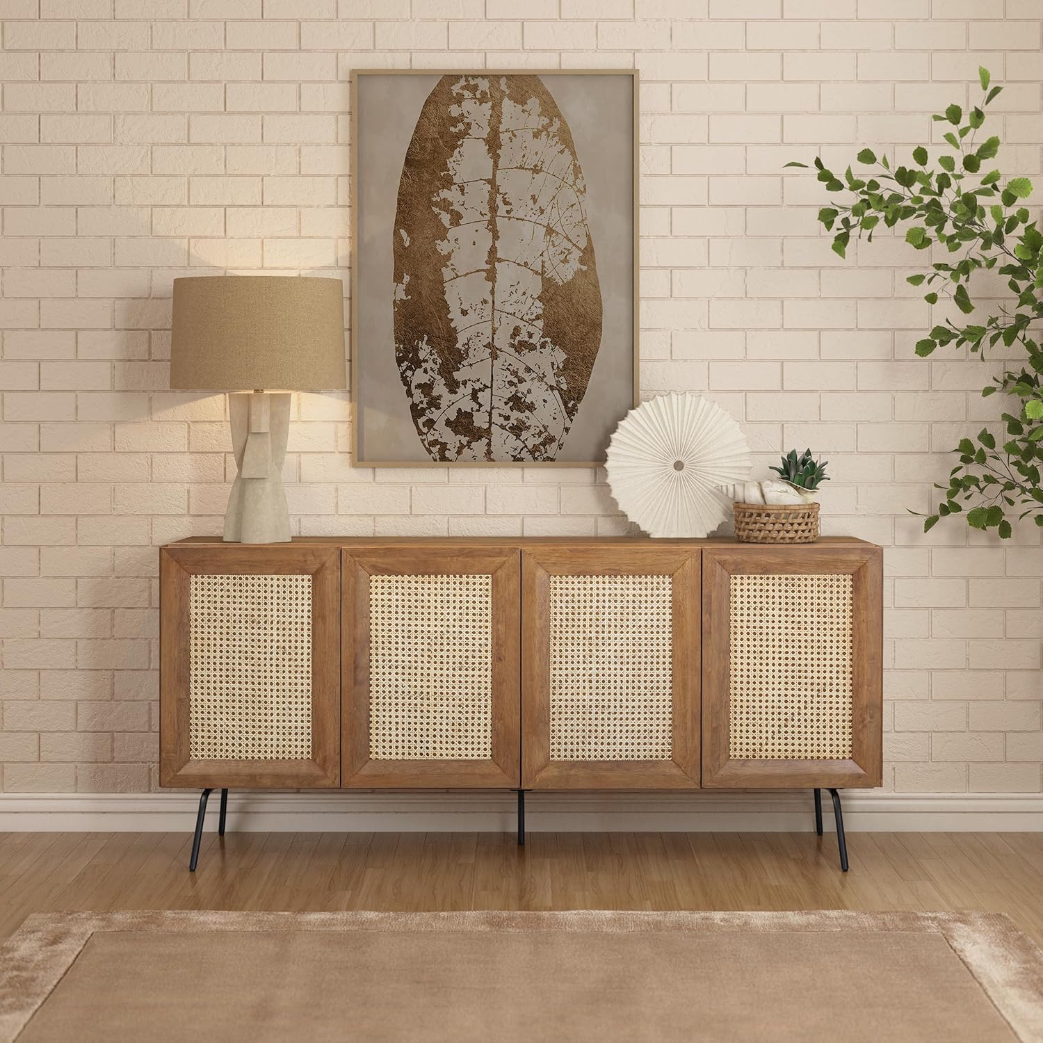 NTC MOSSIC Modern Sideboard with 4 Doors, Natural Rattan Storage Cabinet, Buffet with Metal Legs, Boho Accent Cabinet for Living Room, and Entryway, Effortless Assembly, Teak Look