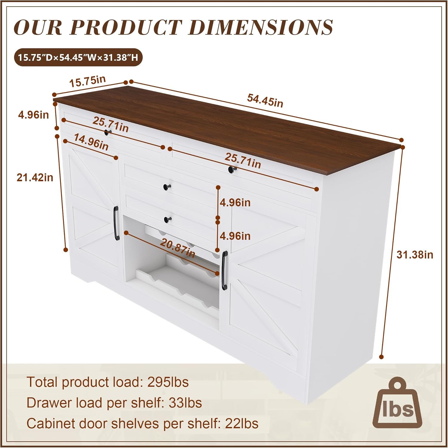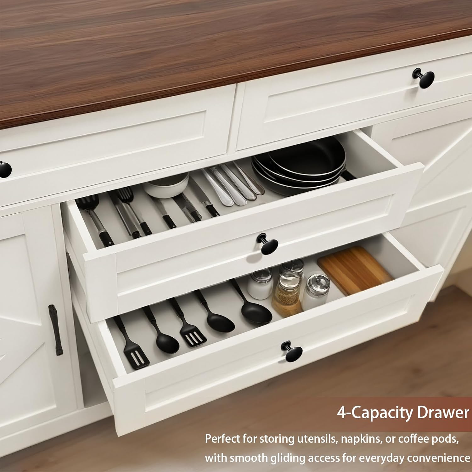 - 【Ample Storage Solution】This buffet sideboard provides a versatile storage system featuring 2 adjustable shelves, 6 wine racks, 4 drawers, and 2 side doors with additional shelving. It offers plenty of space for everything from plates and serveware to jars, bottles and small appliances. Features a dedicated wine rack that holds up to 6 bottles of your favorite vintages, making it perfect for keeping your kitchen, dining, or living room organized and clutter-free.