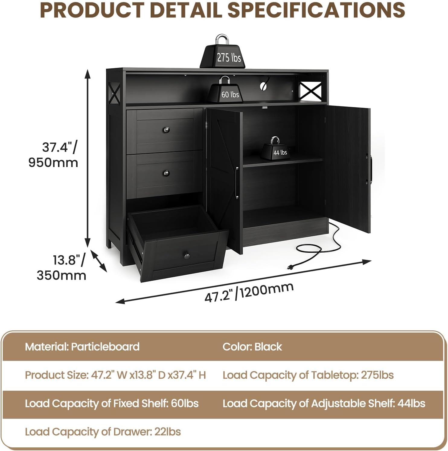 47" Farmhouse Sideboard Buffet Cabinet with Storage & Built-in Power Outlet,Coffee Bar Table Kitchen Buffet Cabinet with 3 Drawers and Barn Doors, Adjustable Shelves for Living Room Dining Room Black