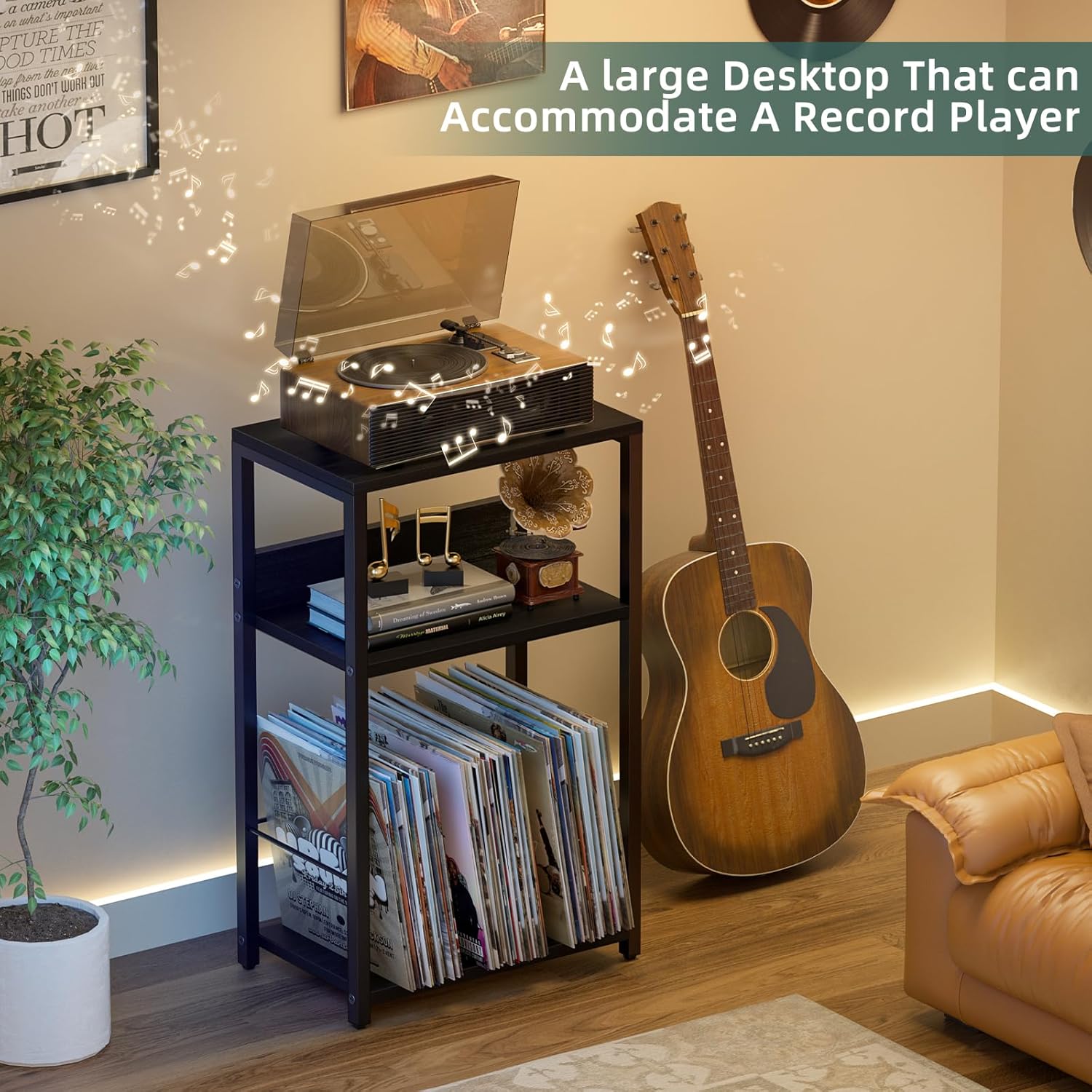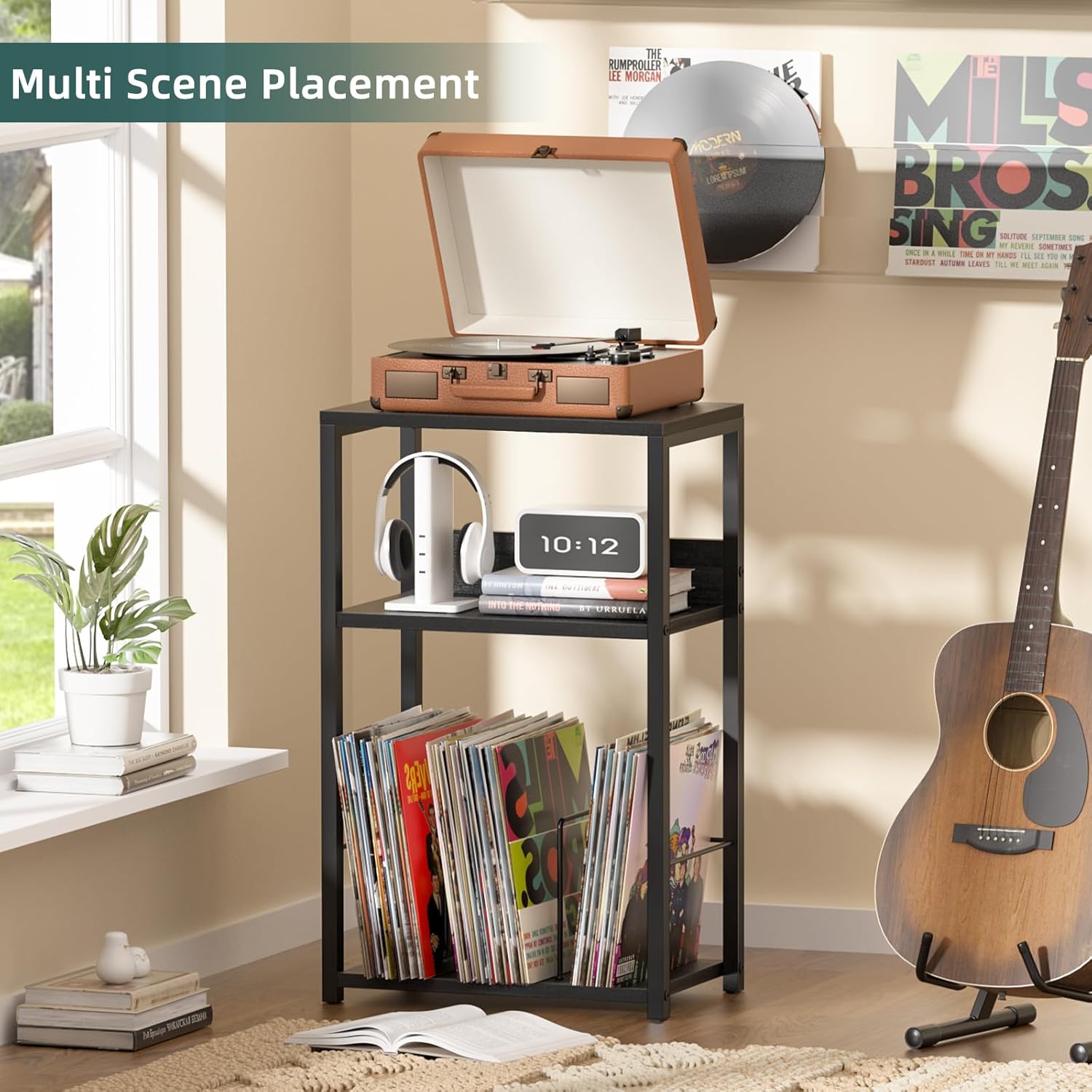 - The simple three-layer record player stand can hold up to 120 albums : Our record stand with its appropriate size of 15.8 "D x 11.8" W x 25.6 "H, can not only be used for vinyl record storage, but also as a sofa side table or end table in small spaces. Its height is moderate, allowing you to easily enjoy a cup of hot milk or place other items on top. The detachable U-shaped partition allows for customizable storage space at the bottom.
