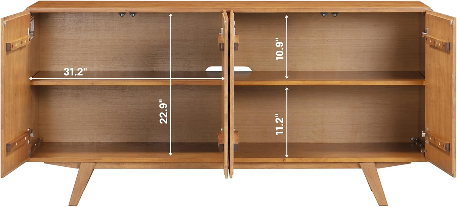 NTC Sapa Mid-Century Modern Solid Wood Sideboard – 4-Door Accent Buffet Cabinet with Carved Geometric Fronts, for Living Room, Dining Room, or Entryway, Effortless Assembly, Teak Look