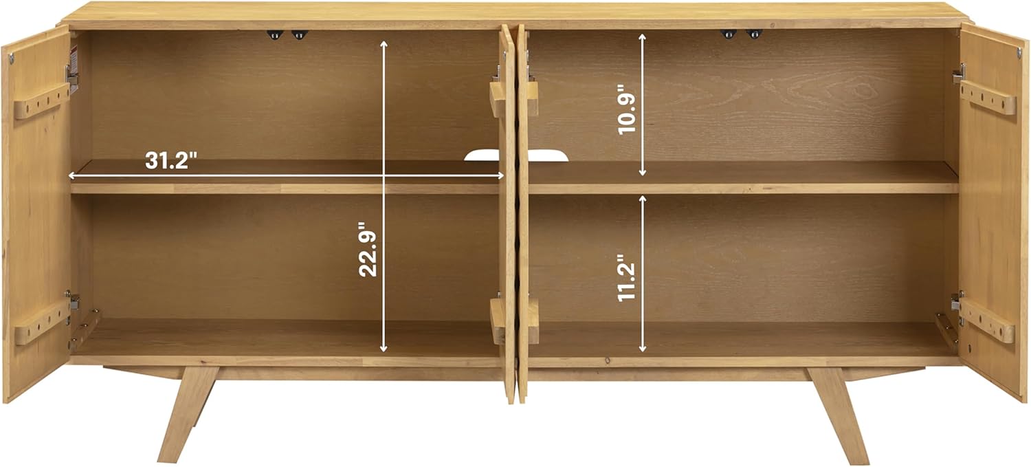 NTC Sapa Mid-Century Modern Solid Wood Sideboard – 4-Door Accent Buffet Cabinet with Carved Geometric Fronts, for Living Room, Dining Room, or Entryway, Effortless Assembly, Sand