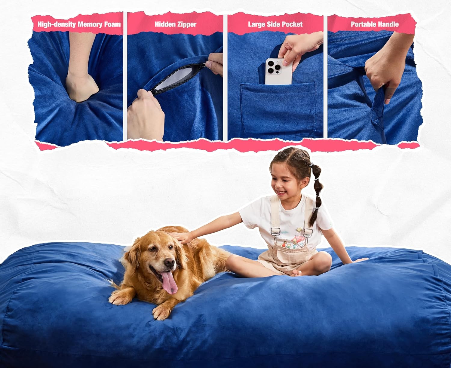 Hobestluk 6FT Bean Bag Chair Large Beanbag Lounger with Removable Cover Adult Bean Bag Chair with Portable Handle Desgin for Living Room Bedroom (Blue, 6FT)