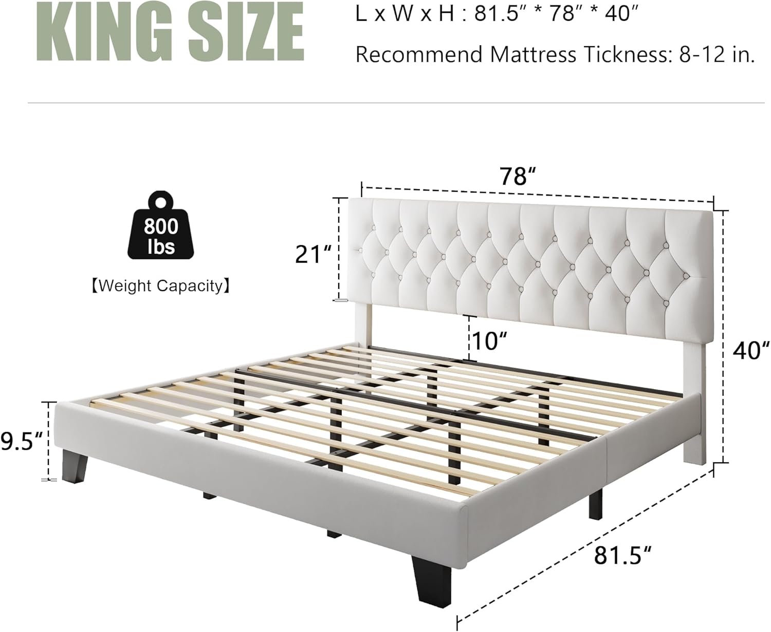 Feonase King Size Velvet Platform Bed Frame, Upholstered Bed with Button Tufted Headboard, Sturdy Wooden Slats & Heavy Duty Feet, No Box Spring Needed, Noise-Free, Easy Assembly, White