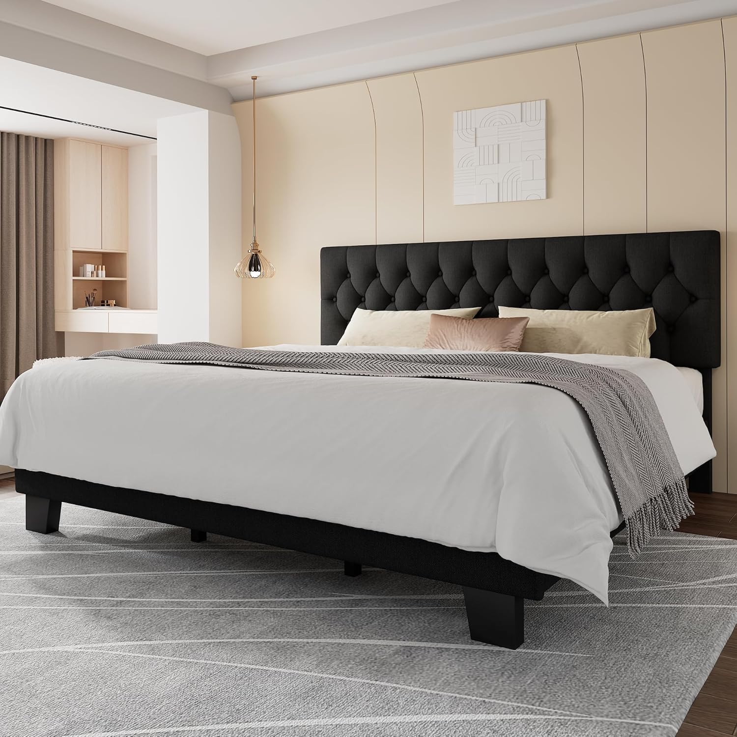 Feonase King Size Platform Bed Frame, Upholstered Bed with Button Tufted Headboard, Heavy Duty Wooden Slats & Thickened Feet, No Box Spring Needed, Noise-Free, Easy Assembly, Black