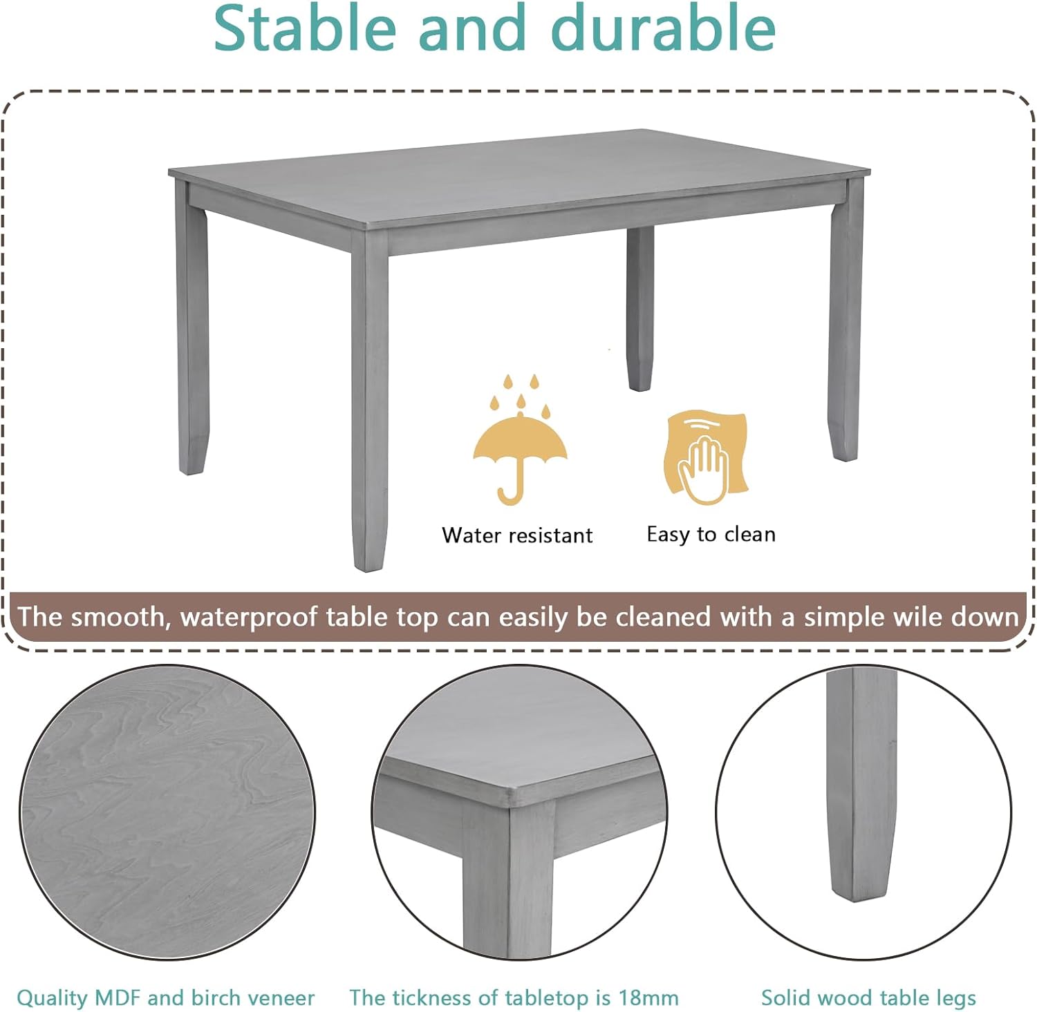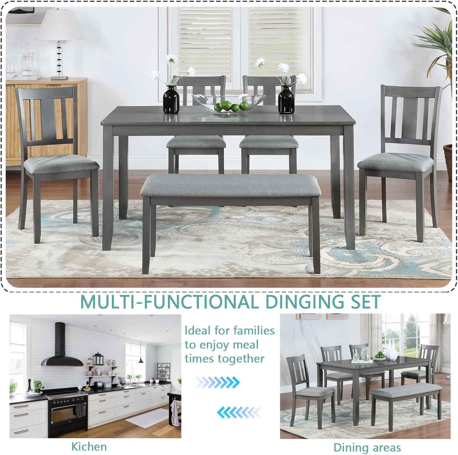 - Trusted Quality: The table top is made of high quality MDF and birch veneer with a water and oil resistant surface that is easy to clean. The frame and legs are made of high quality solid wood, which is durable and hardwearing to ensure a long service life. The four chairs and bench are upholstered to provide a comfortable seating experience, allowing you to relax and enjoy your meal. The sturdy wooden backrest provides reliable support. The table and chairs can support up to 330lbs