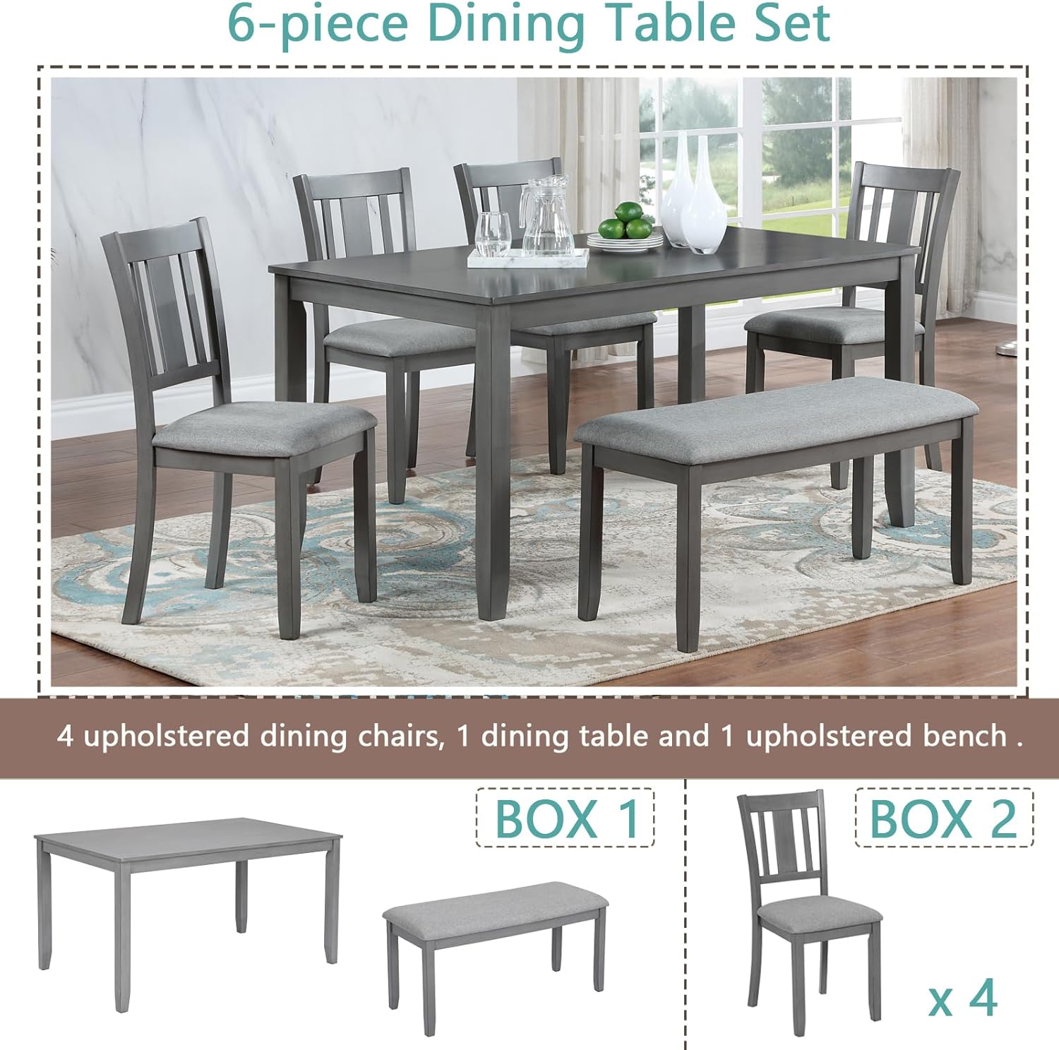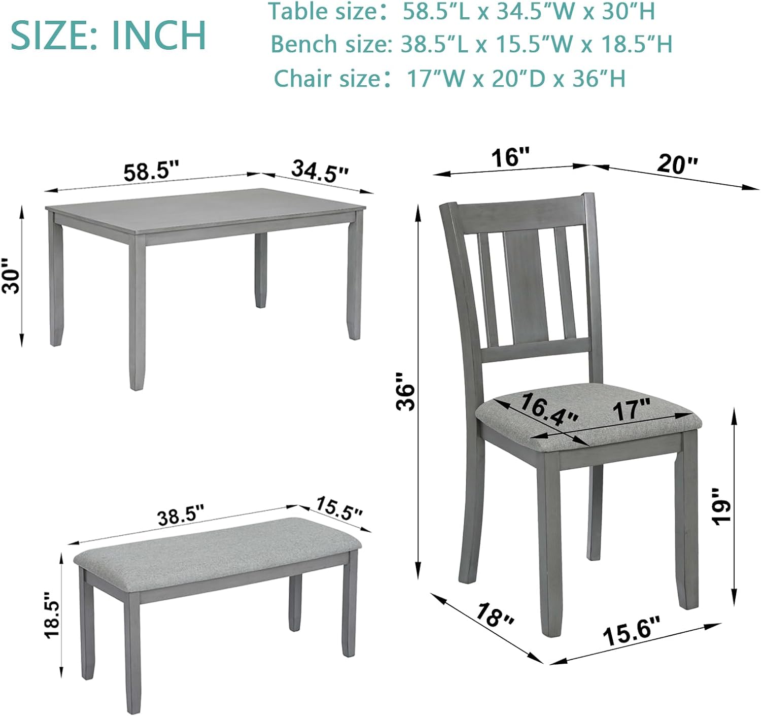 - Assembly and Dimensions: Comes in two boxes with this dining table set. Easy to follow instructions and streamlined construction allow for simple installations that can be completed quickly and easily. With the dimension of table size: 58.5”L x 34.5”W x 30”H, Bench size: 38.5”L x 15.5”W x 18.5”H,Chair size: 17”W x 20”D x 36”H.