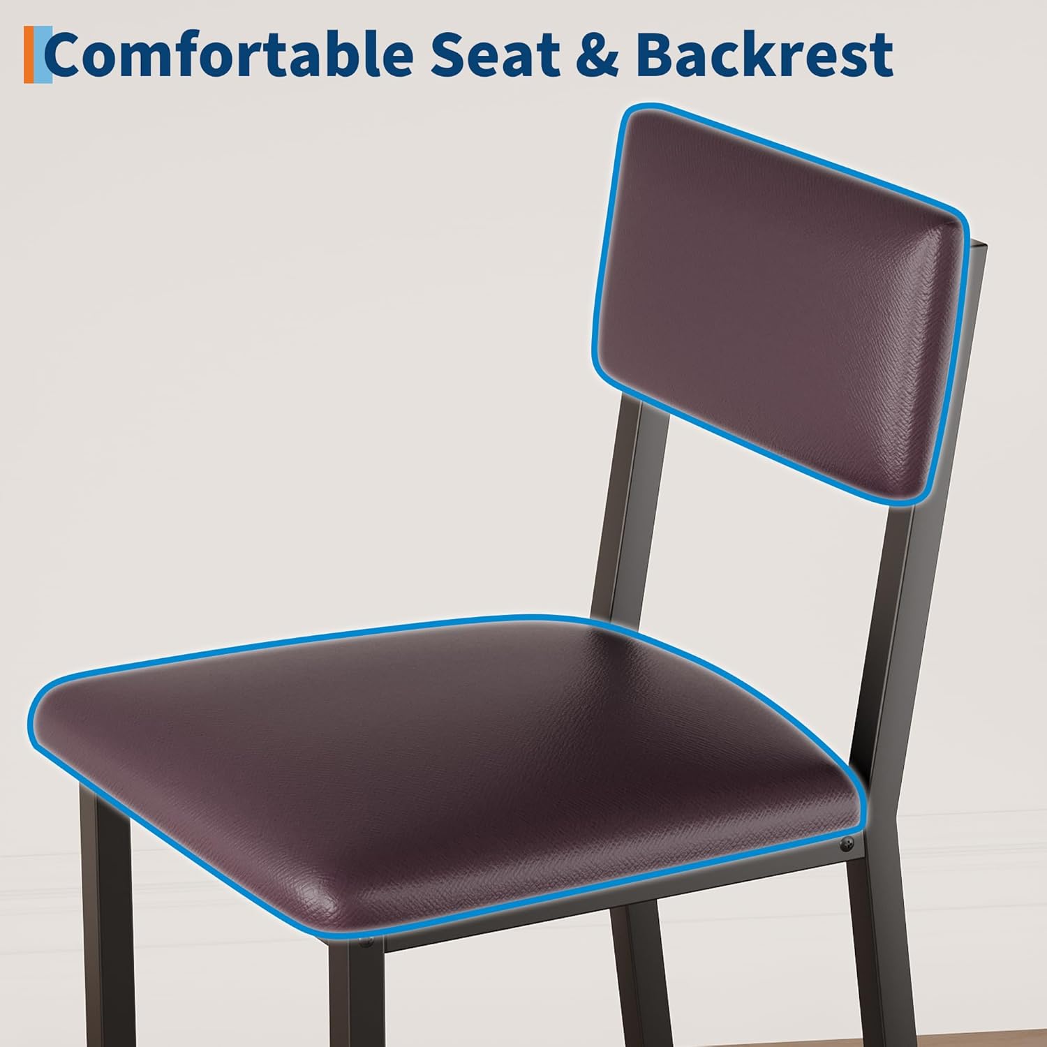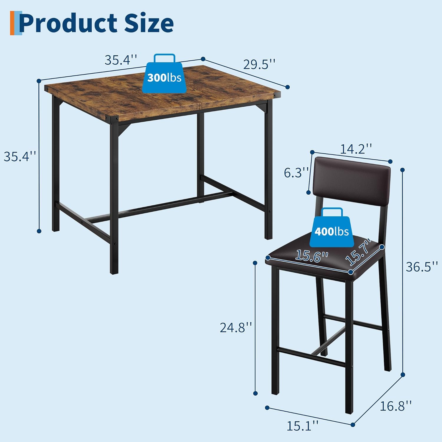 - Durable Tabletop & Cozy Upholstered Bar Stools: The dining table provides a generous 35.5'' x 29.5'' surface, easily accommodating dishes, utensils, and decorative items as needed. Each bar stool features a 15.6'' wide seat upholstered in PU leather and filled with plush sponge padding for enhanced comfort. The ergonomically designed backrest offers excellent body support and helps alleviate back strain, while the built-in footrest lets you rest your legs, ensuring a more enjoyable dining experi