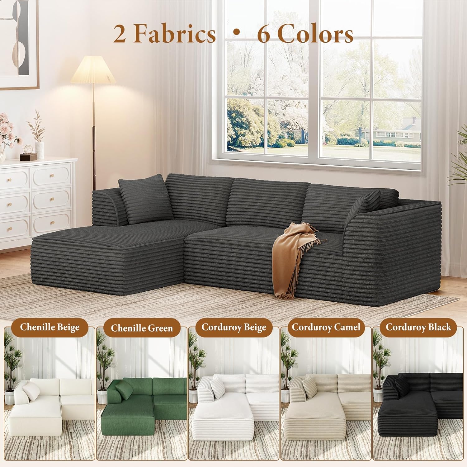 - Available in 6 Color Options: Two premium fabrics include plush corduroy couch and luxurious chenille couch—both offering exceptional comfort, lasting durability, and easy upkeep. These skin-friendly, pet-resistant materials withstand scratching while maintaining their softness, perfect for families with children and pets. For added convenience, the removable throw pillow covers and back cushion covers are machine-washable, effortlessly blending style with practicality—ideal for anyone seeking a fresh, low-maintenance sectional couches for living room