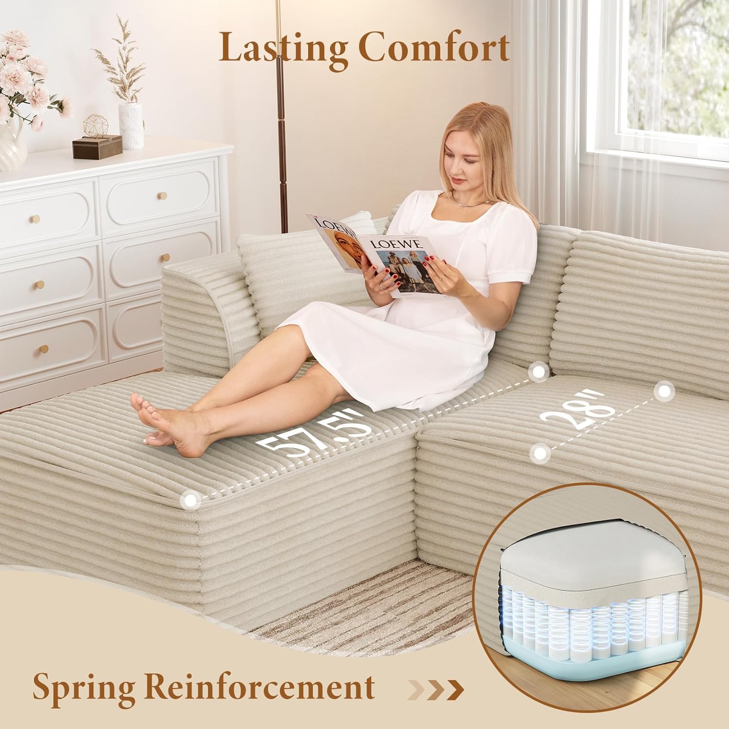 - Comfortable Support: Expertly engineered with a high-density foam and spring system that delivers the perfect balance of plush softness and supportive structure—the integrated spring system provides lasting resilience and extended durability, while the memory foam delivers a sensation of cloud-like comfort. Designed for ultimate relaxation, the generous 28" seat depth, elevated back cushion and arcuate armrests create an inviting lounging oasis, while the spacious 58" chaise lounge offers ample room to stretch out. Thoughtfully incorporated ergonomic features ensure ideal support for prolonged sitting or reclining
