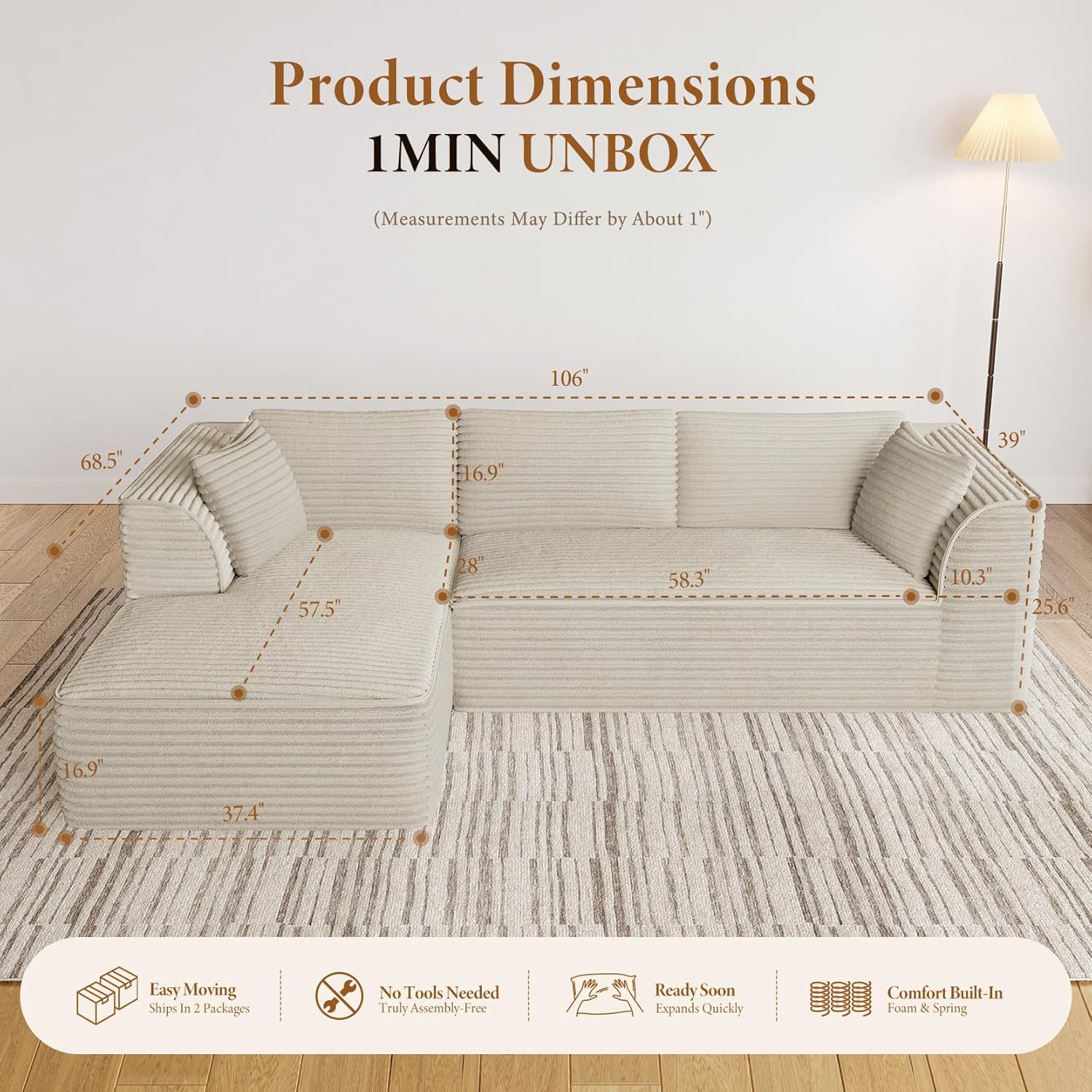 Vesgantti 106" Boneless Couch with Chaise, Deep Seat Comfy Cloud Modular Sofa Corduroy Memory Foam Sectional Couches for Living Room Bedroom, No Assembly Required (Camel, Left-Facing Chaise)