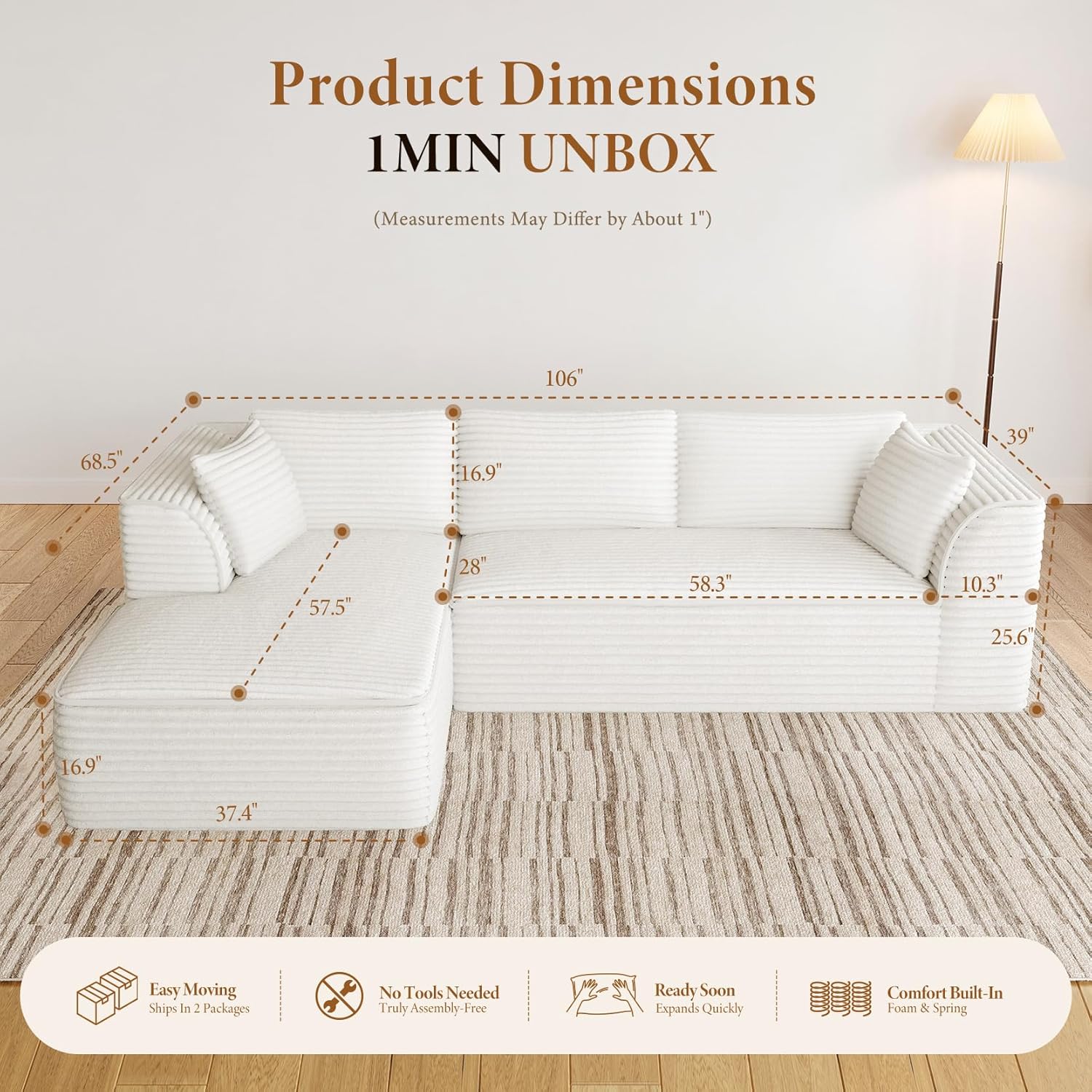Vesgantti 106" Boneless Couch with Chaise, Deep Seat Comfy Cloud Modular Sofa Corduroy Memory Foam Sectional Couches for Living Room Bedroom, No Assembly Required (Beige, Left-Facing Chaise)