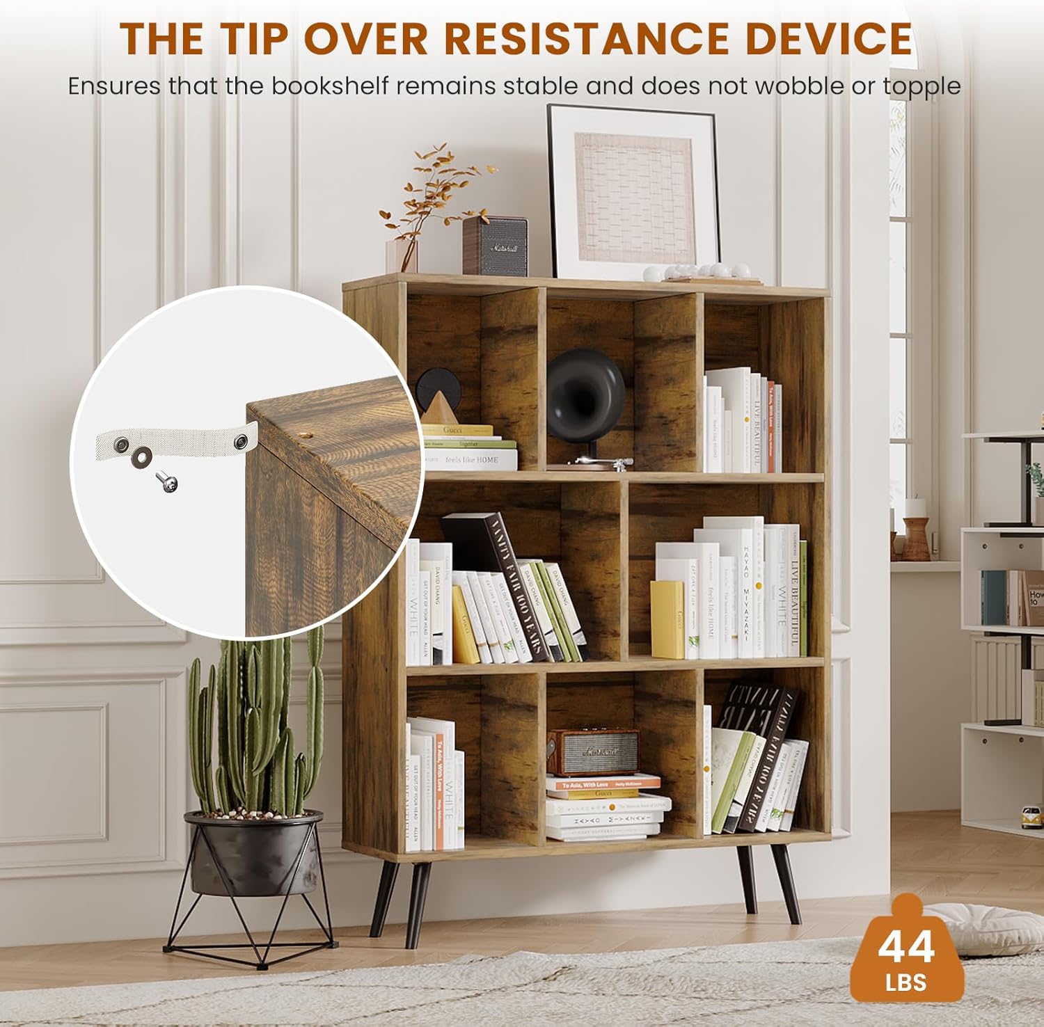 8 Cube Bookshelf 3 Tier Mid-Century Rustic Brown Modern Bookcase with Legs,Retro Wood Book Shelf Storage Organizer Shelf,Freestanding Organizer Display Shelf for Bedroom,Living Room,Office