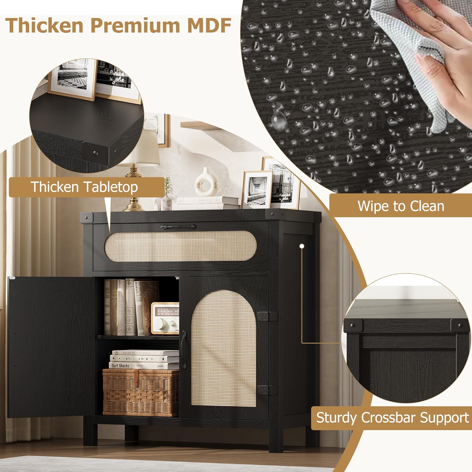 IDEALHOUSE Rattan Cabinet with Drawer, Sideboard with Synthetic Rattan-Accent Doors, Adjustable Shelves, Buffet Cabinet for Living Room Dining Room, Black
