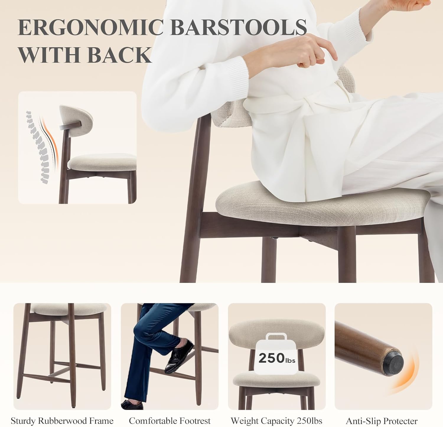 - ❗❗❗Shipped in multiple packages, you may not receive them at the same time! 【Mid Century Modern Bar Stools】Mid century modern bar stools with wood legs combine timeless style, everyday comfort, and reliable stability. Crafted from high-quality wood, these counter height bar stools with backs are built for durability. At 25 inches tall, the upholstered seats provide comfortable support for various users, making these stools a versatile addition to your kitchen island, dining room, or home bar.
