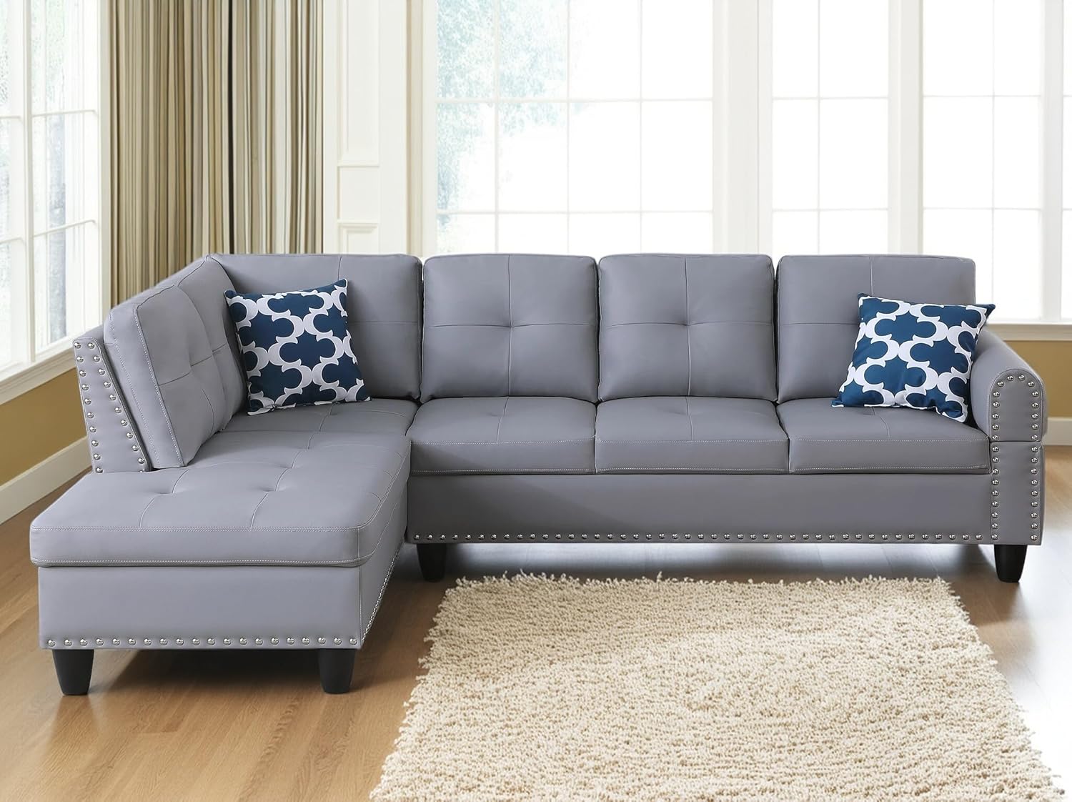 98 Inch L Shaped Sectional Sofa with Chaise Lounge, Storage Ottoman and 2 Pillows, 4-Seaters Faux Leather Upholstered Tufted Couch w/Cupholder & Nailhead Trim for Living Room, Office, Gray