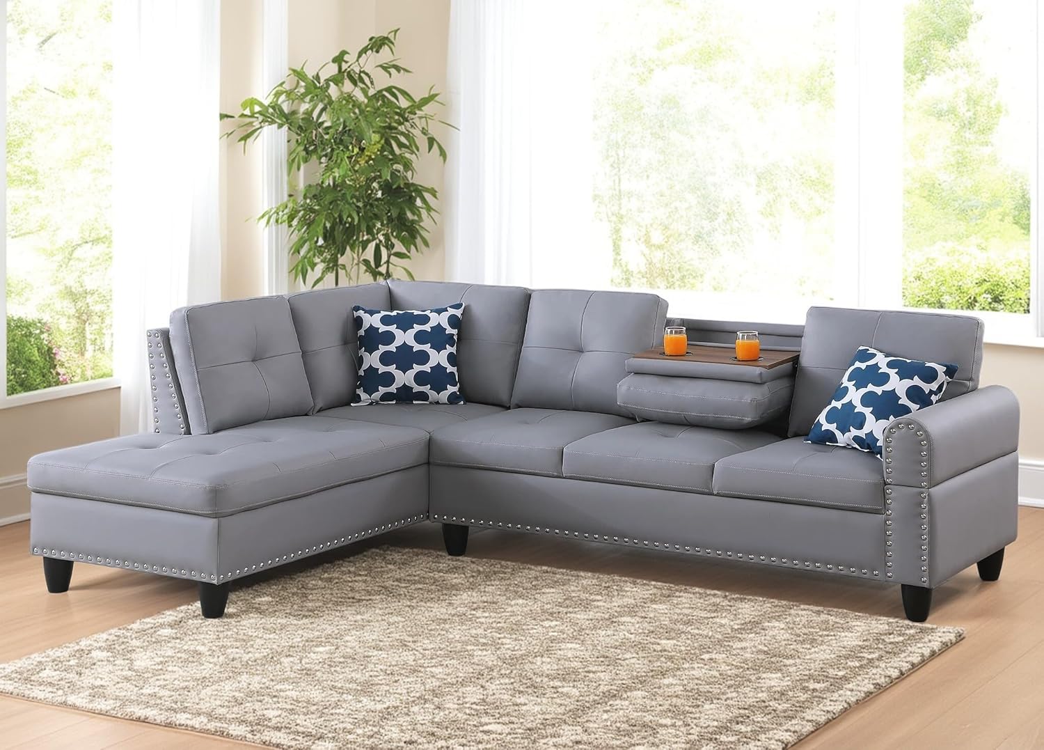 - Sectional Couch with 2 Cup Holders - Each piece features a solid and manufactured wood frame that rests on low-profile dowel legs. Wrapped in sleek, neutral-toned Faux Leather, this set's cushions are filled with foam and have eight-way hand-tied springs to limit sagging over time. Rounded arms, subtle tufting, and nailhead trim complete this traditional design, One of the middle seats pulls down to reveal two cup holders for your favorite beverages