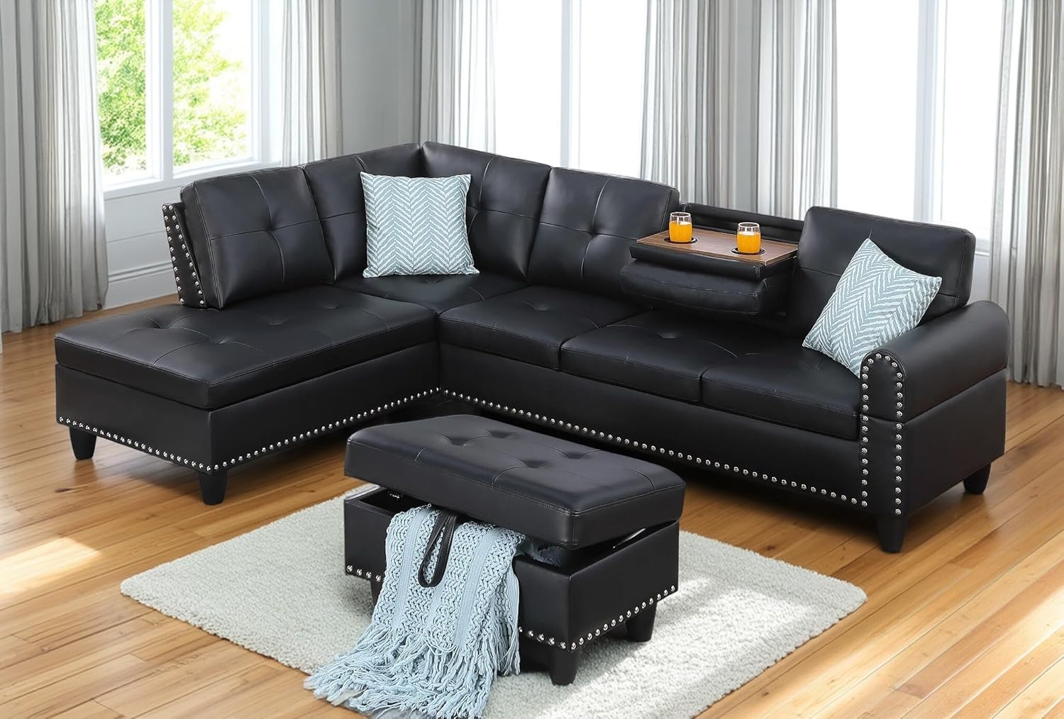 98 Inch L Shaped Sectional Sofa with Chaise Lounge, Storage Ottoman and 2 Pillows, 4-Seaters Faux Leather Upholstered Tufted Couch w/Cupholder & Nailhead Trim for Living Room, Office, Black