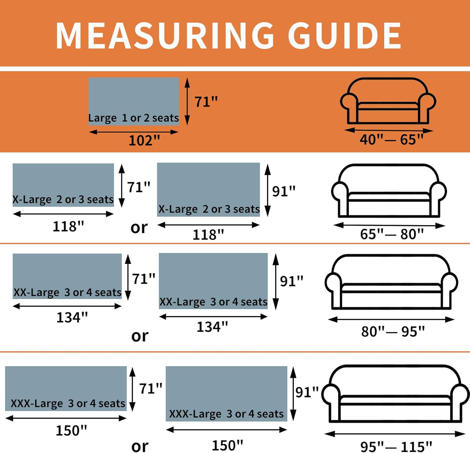 - SIZE CHOICE: Please measure your furniture size before choosing couch covers for sofa, size 71 "x 102" is suitable for single or small loveseat, size 71 "x 118" or 91 "x 118" is suitable for loveseat or small 3 seat sofa, couch blanket cover size 71 "x 134" or 91 "x 134" is suitable for 3 seat or small 4 seat sofa, size 71 "x 150" or 91 "x 150" is suitable for couch covers for oversized sofa, couch covers L Shape allows you to choose 2 pieces of sofa cover,please refer to the measurement in the picture 5 for details Guide.