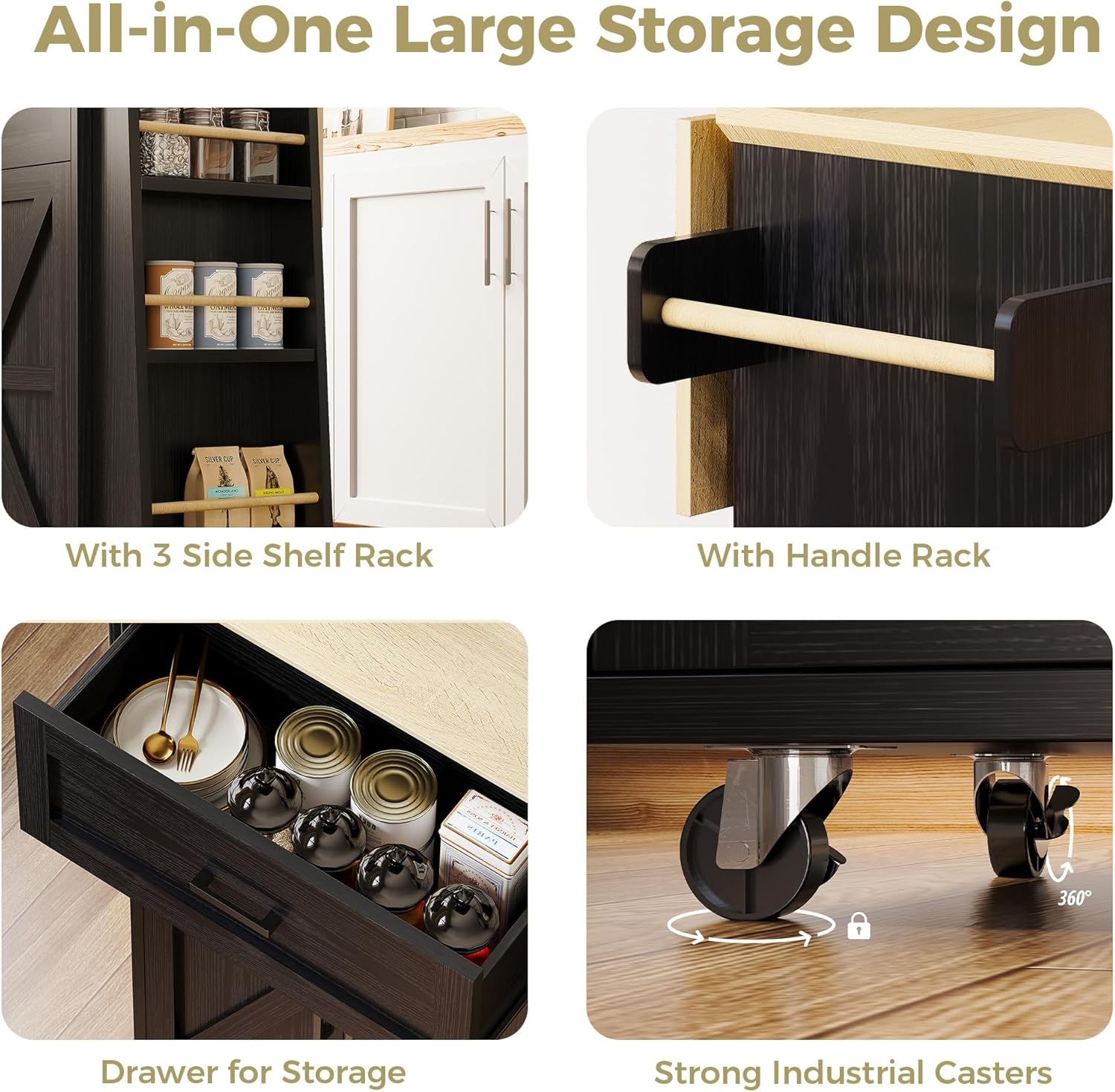- Sturdy and Easy to Clean: Built with robust materials, this island cart stands up to daily kitchen wear. Wipe spills effortlessly on surfaces, while reinforced storage cabinets handle daily kitchen demands. It can be used as a kitchen island, bar cart, or mobile coffee station