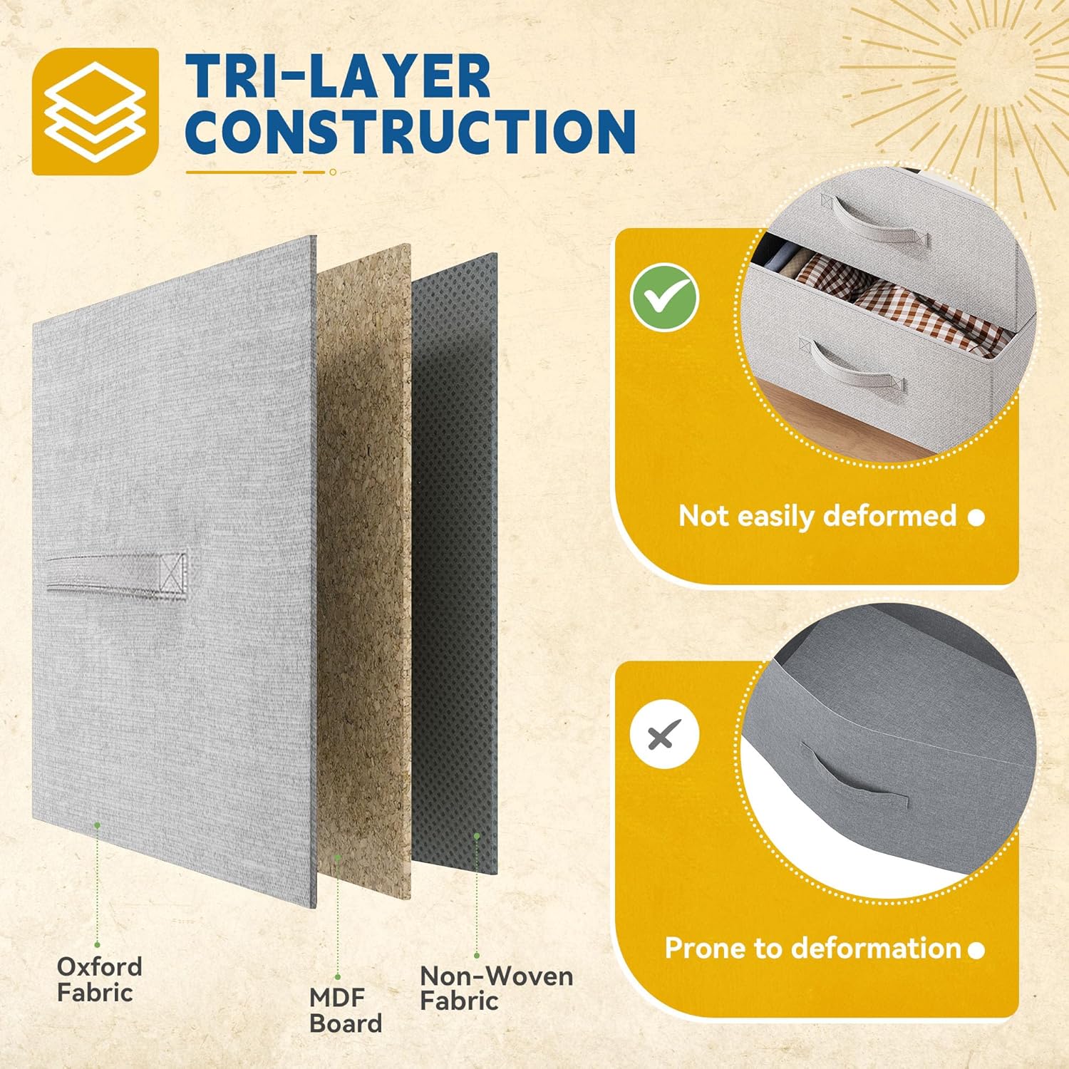 - STURDY DRESSER FOR ROOM- Strong metal frame aptly supports the overall structure; Sleek MDF wooden top plus non-woven synthetic fabric increases durability