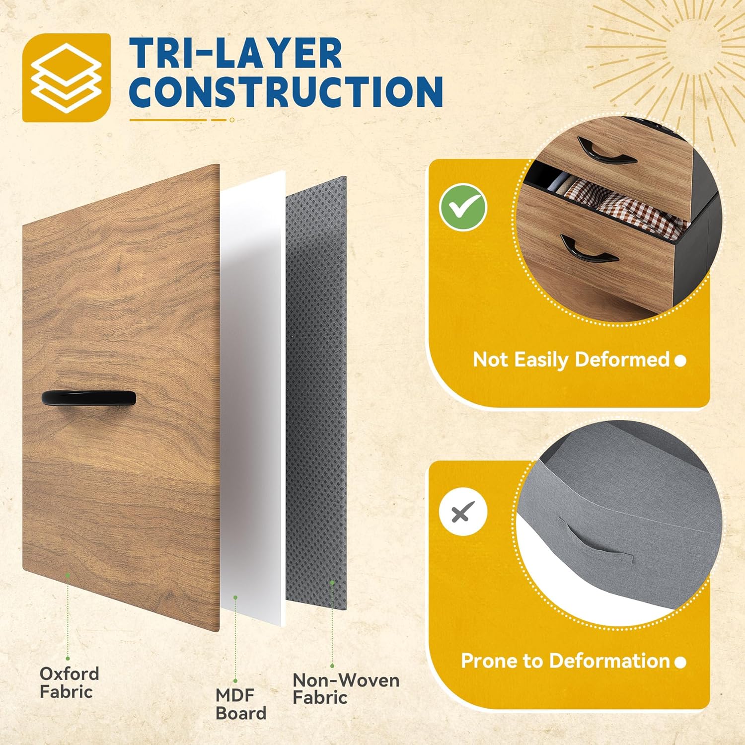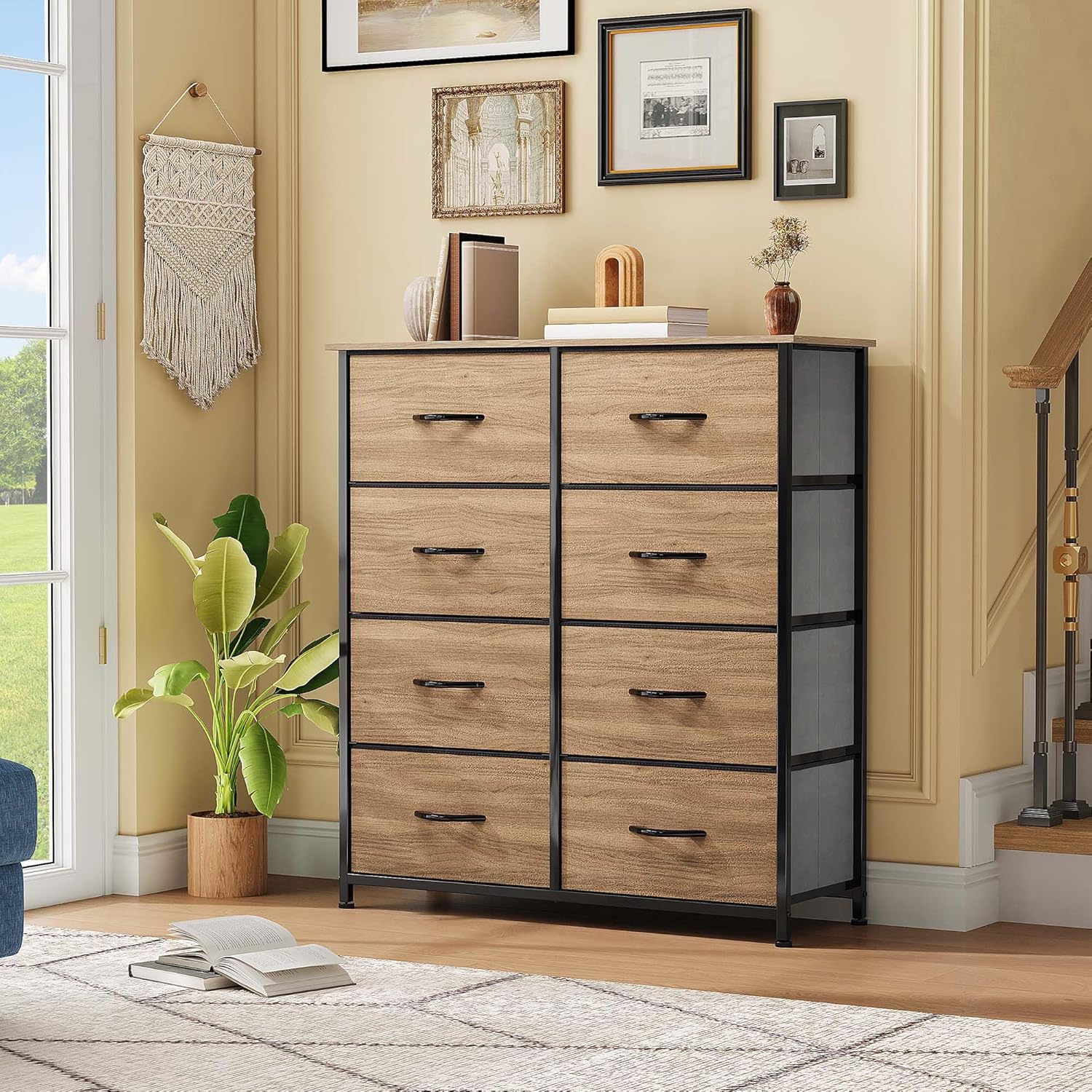 - ROOMY FABRIC DRESSER- 8 deep foldable drawers are spacious enough to hold your clothes and daily necessities; Large wooden top is great for showcasing your lamps, clocks, glasses, photos, etc.