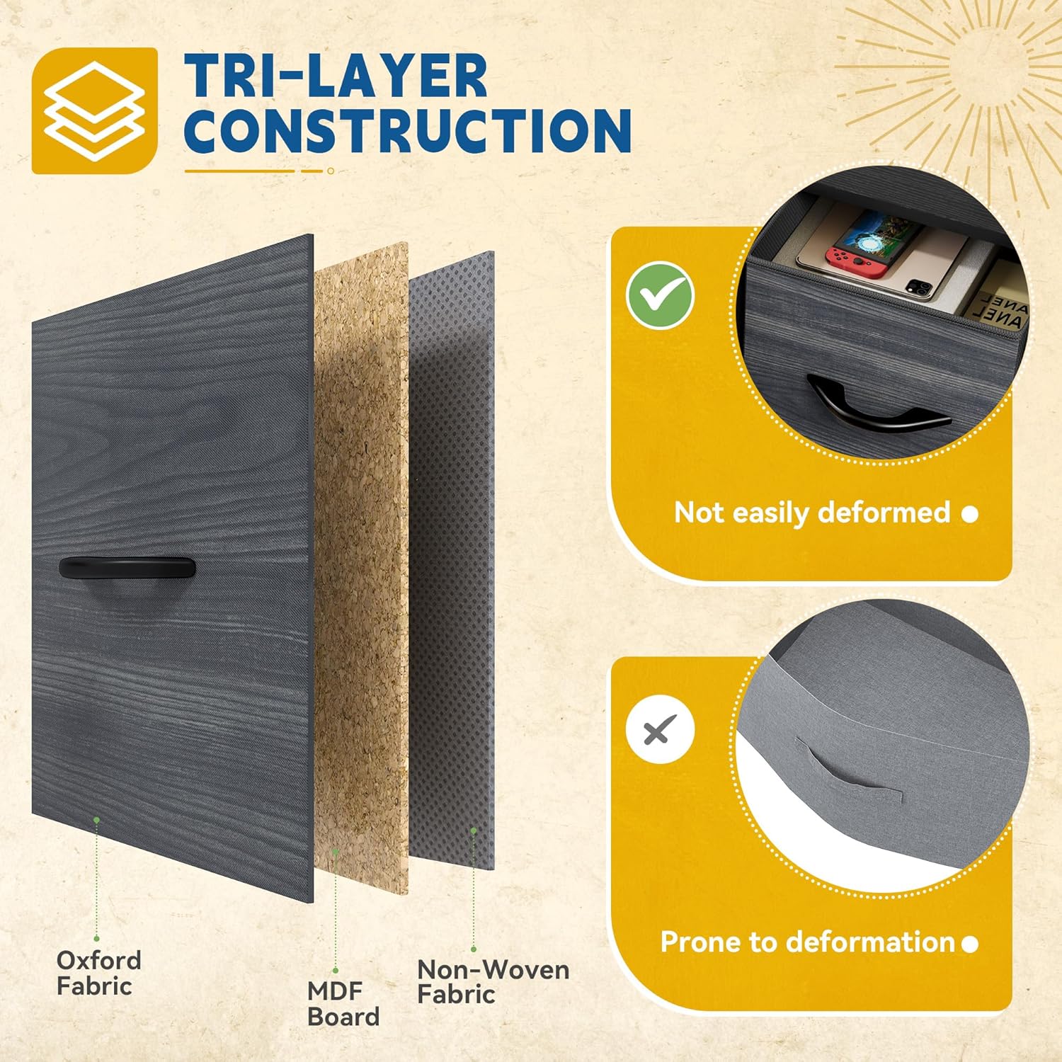 - VERSATILE COLOR SCHEME- Highlights a sleek, modern design combining sleek rustic brown fabric drawers, a sturdy black metal frame, and a wooden tabletop for living rooms, hallways, entryways, etc.