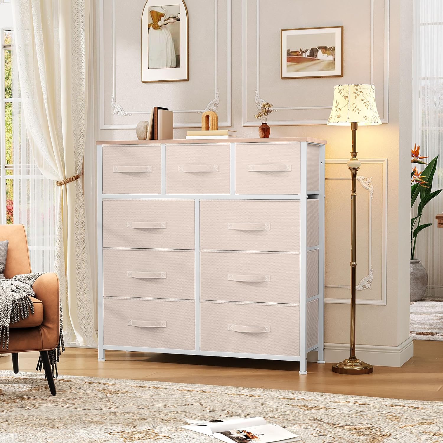 DWVO Dresser with 9 Drawers - Fabric Storage Tower, Organizer Unit for Living Room, Hallway - Sturdy Steel Frame, Wooden Top & Easy Pull Fabric Bins