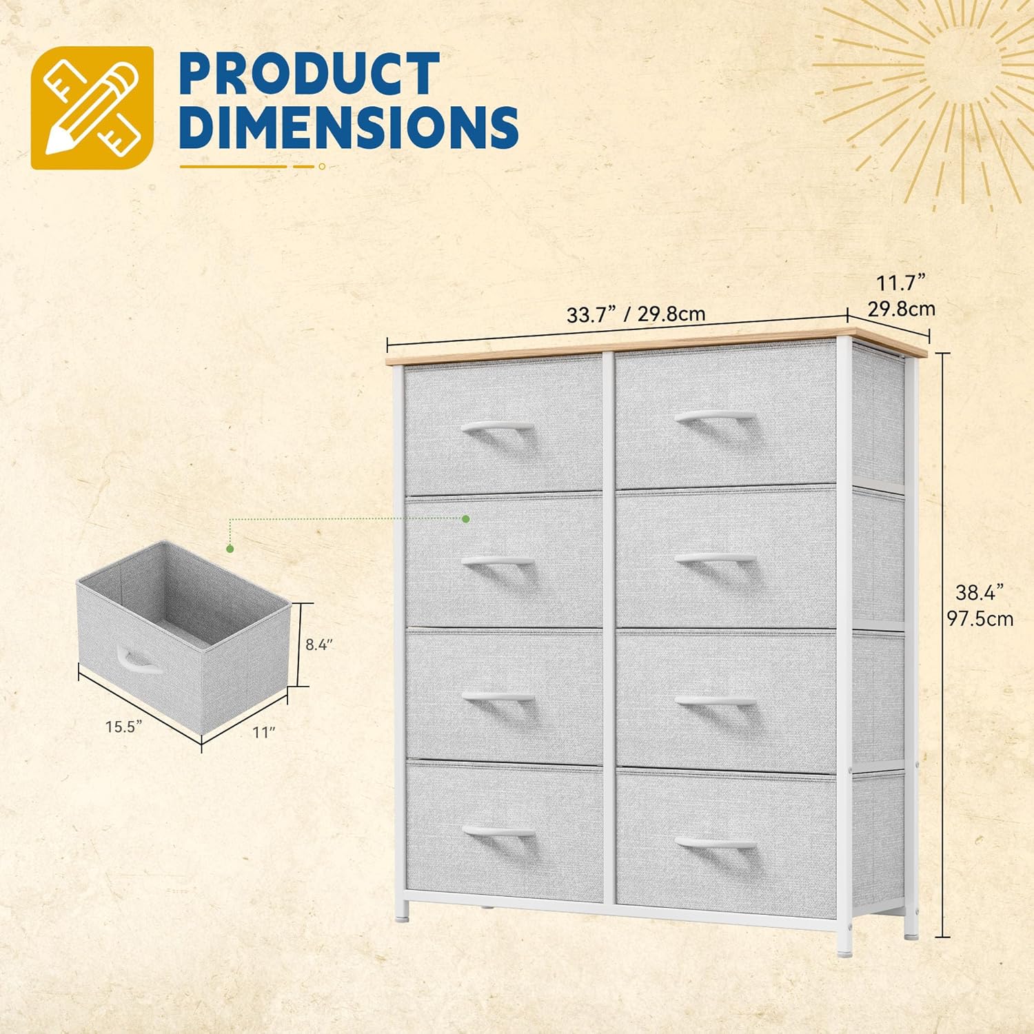 - HIGH CAPACITY- 8 drawers of different sizes provide more storage choices, and sufficient space creates a neat and clean space for your room or living room. Overall Dimensions: 33.7" L x 11.7" W x 38.4" H. Drawer Dimensions: 15.6" L x 11.2" W x 8.5" H