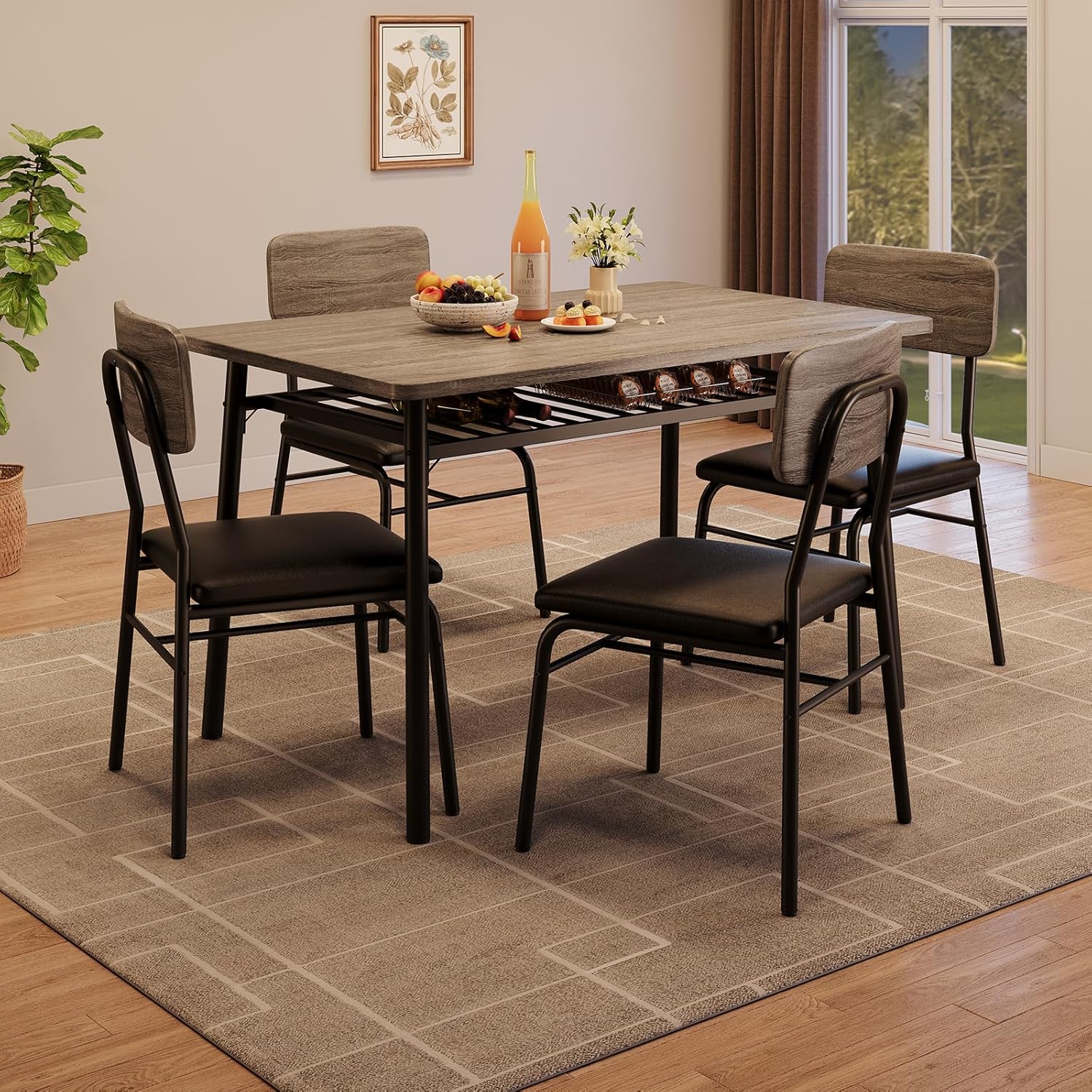 5-Piece Dining Table Set for 4, Wood Kitchen with Built-in Storage Rack, Small Kitchen Table with Upholstered Chairs and Metal Frame for Small Spaces, Gray