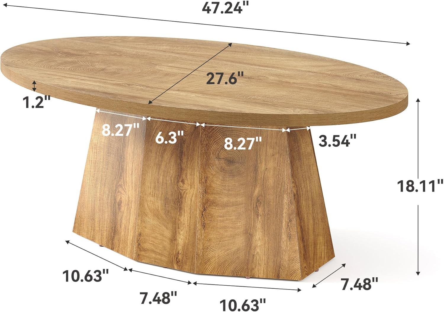 Oval Coffee Table, 47-Inch Living Room Table with Polygonal Pedestal, Modern Center Accent Furniture, Child-Friendly, Easy to Assembly, Yellowish Brown