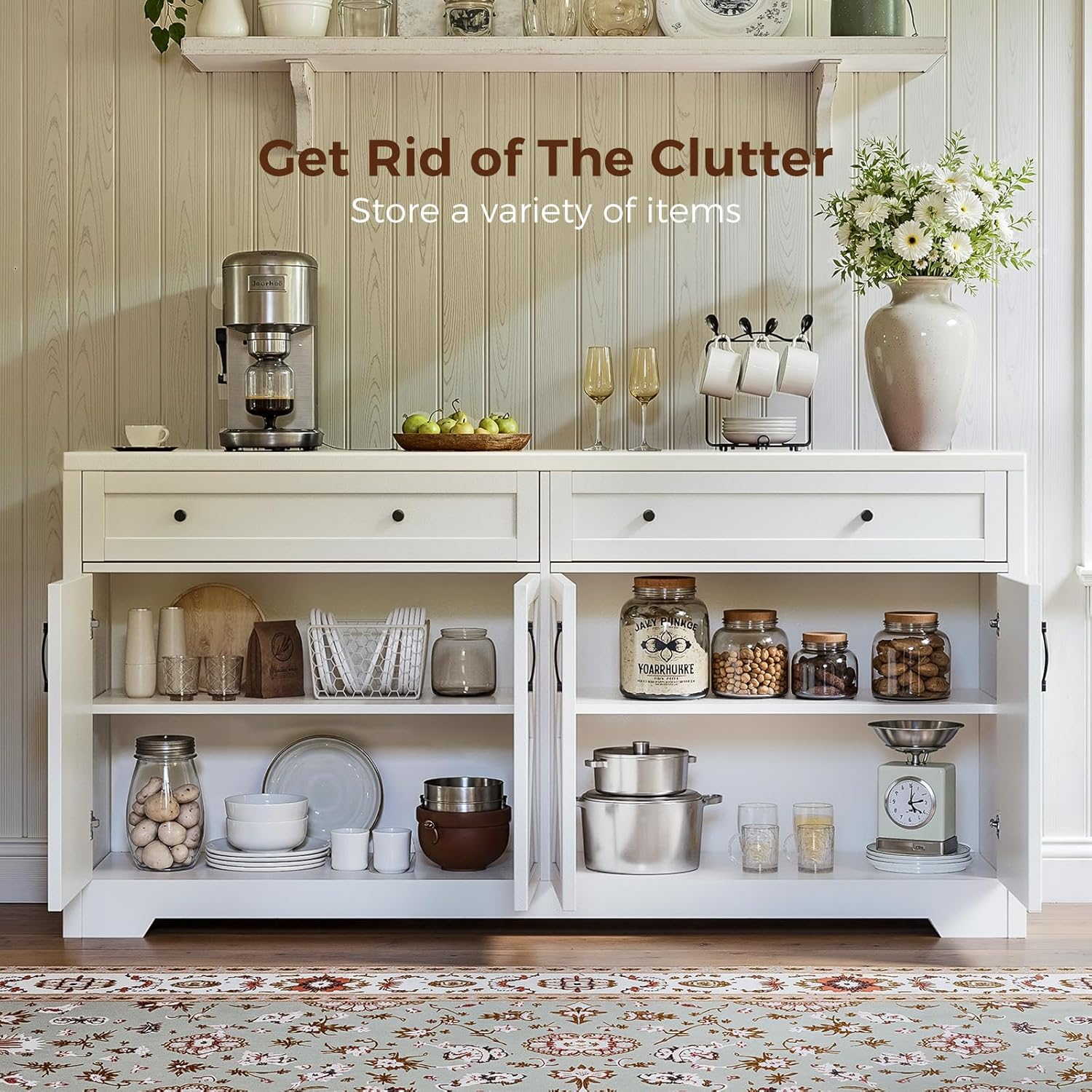 - 【Built to Last】Meticulously crafted from premium materials, this farmhouse sideboard buffet boasts a wide-edge base and adjustable door hinges for unwavering stability and enduring quality