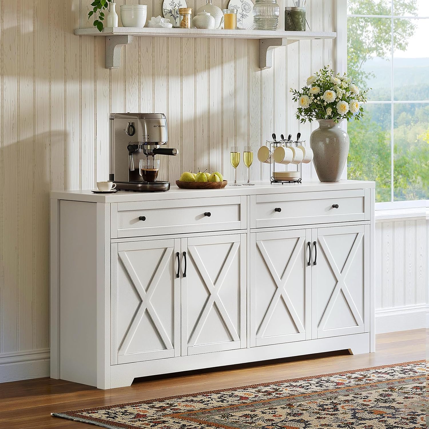 61'' Farmhouse Sideboard Buffet Cabinet with Storage, Large Kitchen Storage Cabinet with Barn Doors Drawers, White Coffee Bar Table for Dining Room Kitchen