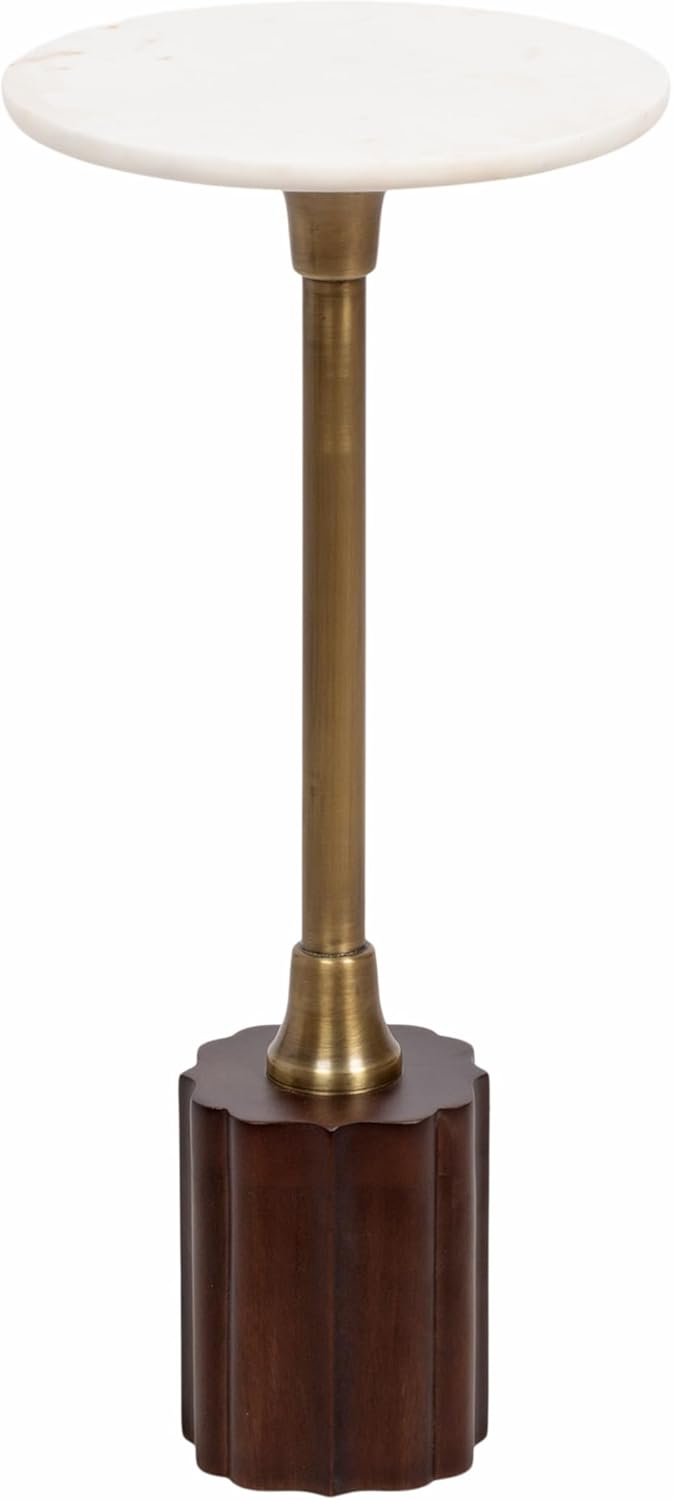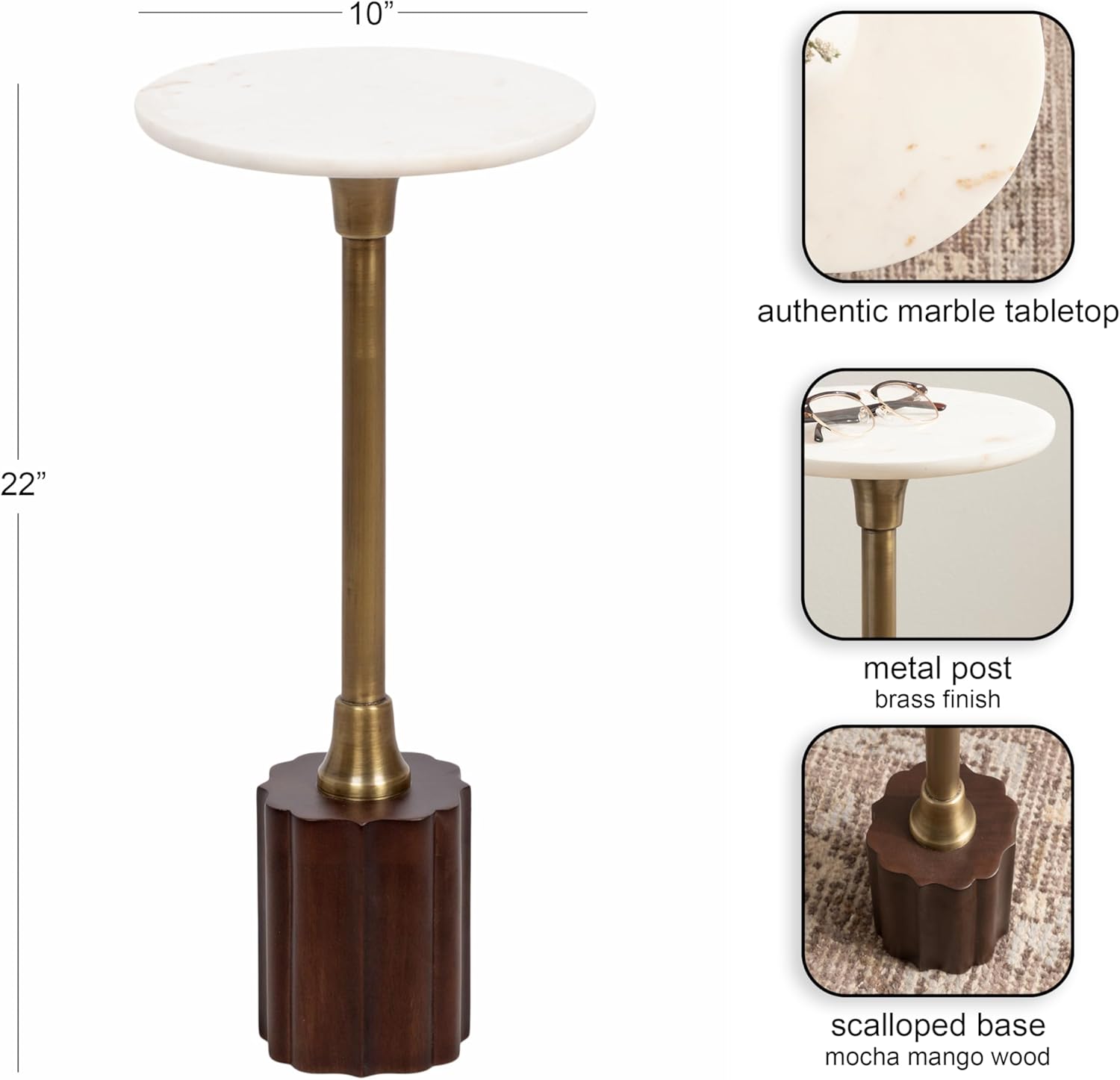 Kate and Laurel Nisha Traditional Marble Round Drink Table, 10 x 10 x 22, White Marble, Antique Brass, and Dark Brown, Vintage Mango Wood Circle Mini Table for Use as Plant Stand or Living Room Decor
