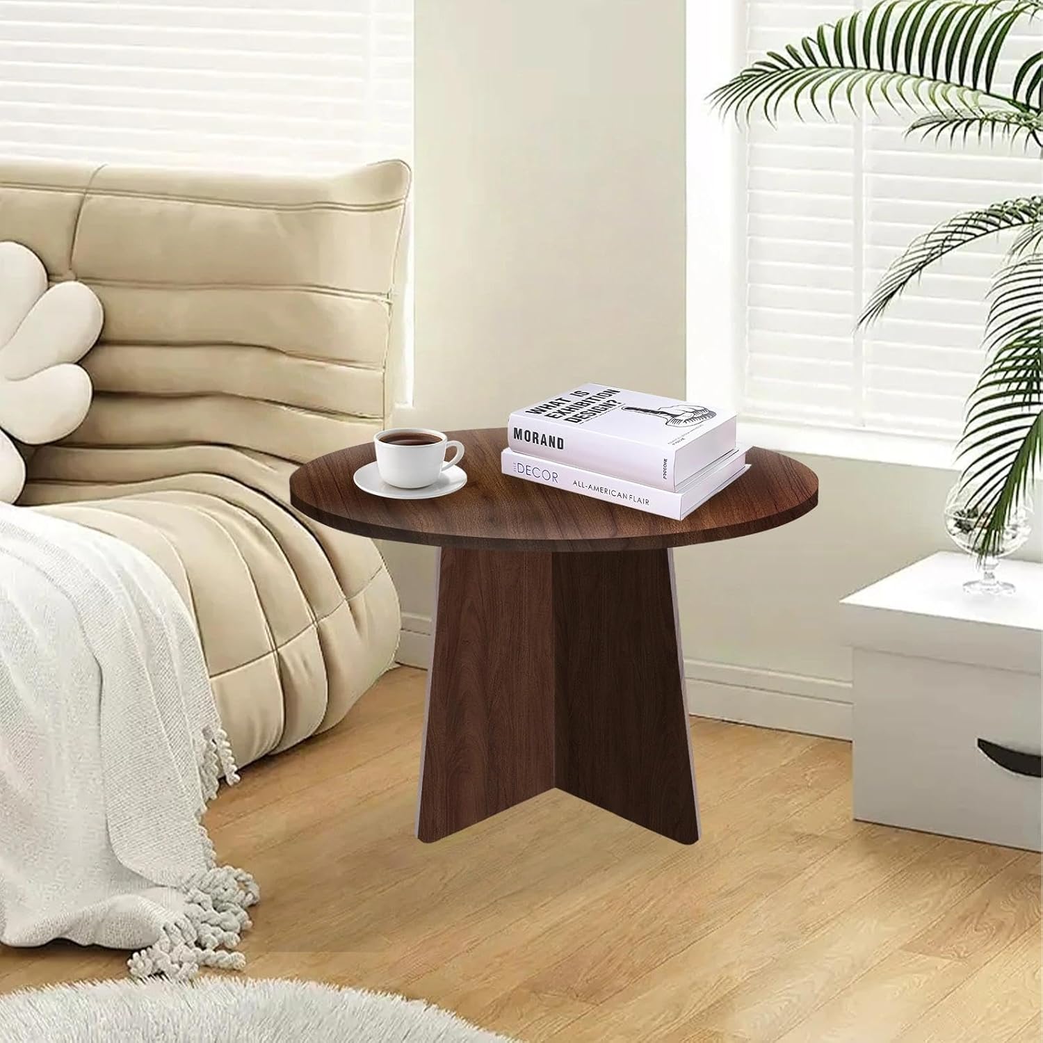 - Sturdy Living Room Table - The base of this round end table is crafted from one large wooden board and two smaller ones, arranged in an X-shaped configuration. This structural design provides the small round table with enhanced stability and long-lasting durability.