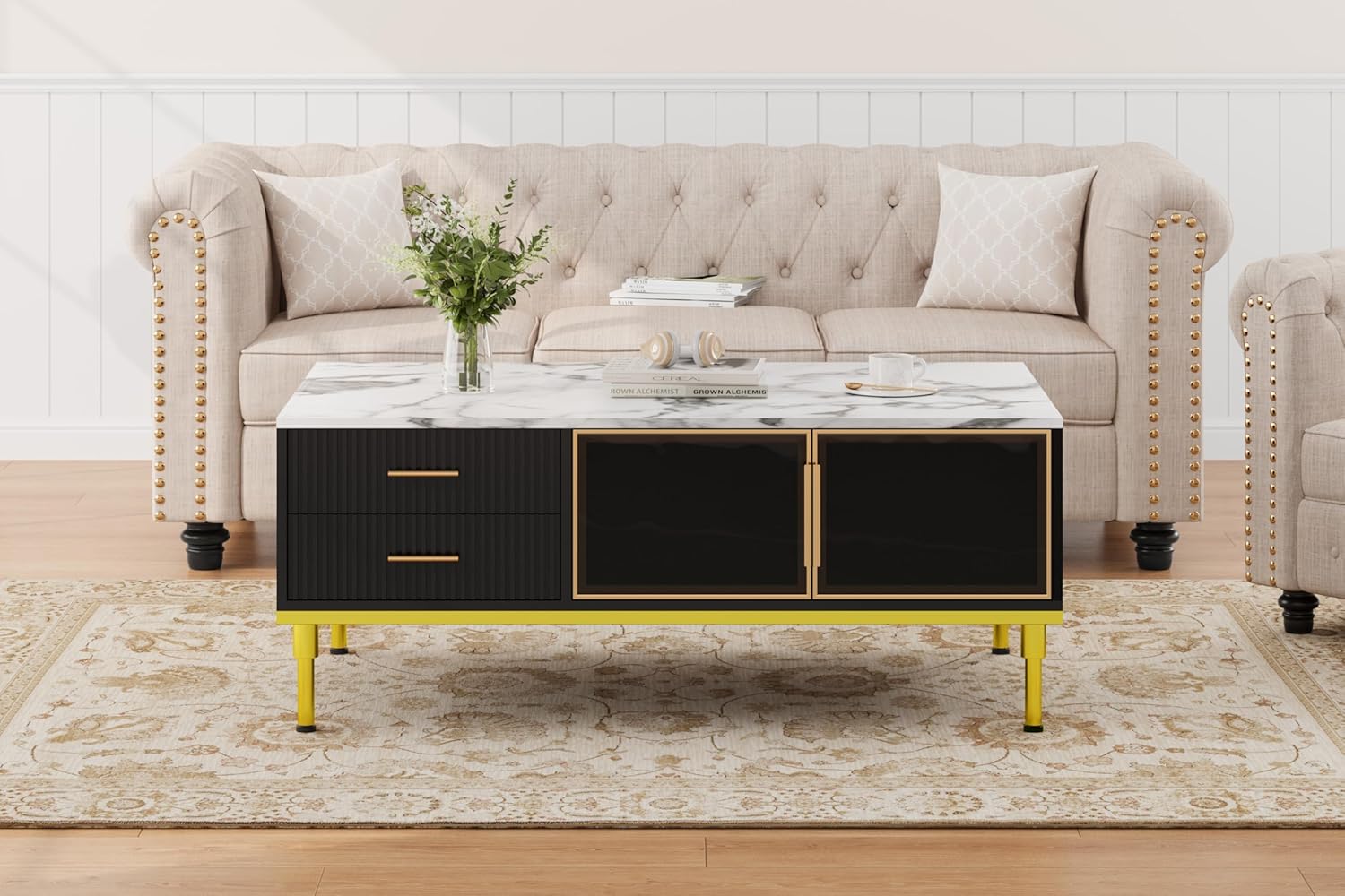 GAOMON Coffee Table for Living Room, Faux Marble Coffee Table with 4 Drawers and Glass Doors Storage, Modern Aesthetic Fluted Panel Design,Black & Gold