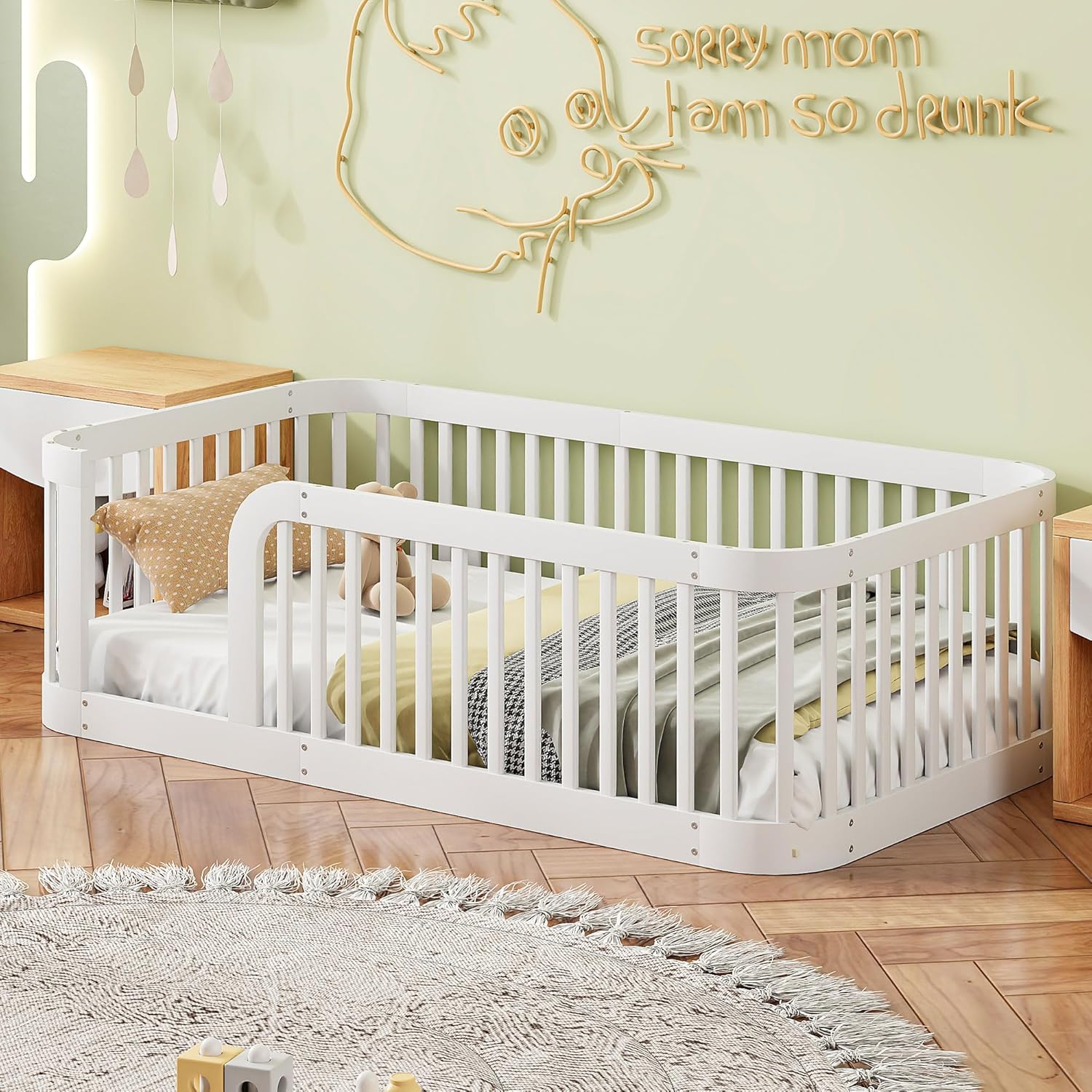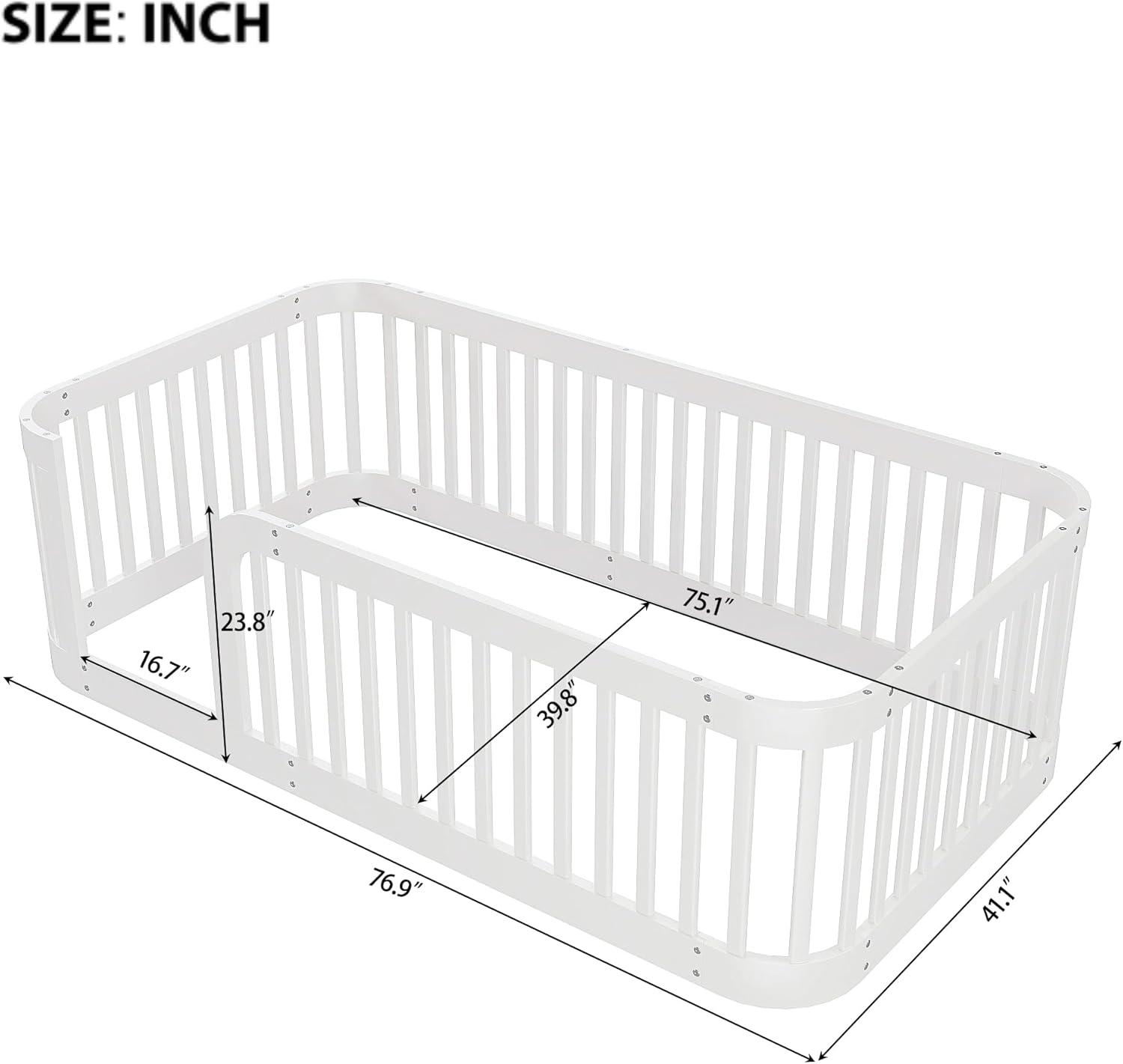 Bellemave Twin Floor Bed with High Fence and Rounded Corner Design, Wood Montessori Floor Bed with Guardrail and Entrance, Easy Assemble Montessori Bed Twin Size, White