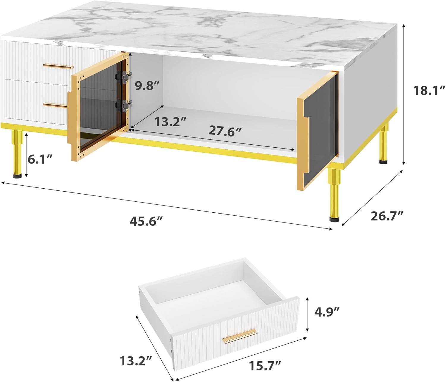 GAOMON Coffee Table for Living Room, Faux Marble Coffee Table with 4 Drawers and Glass Doors Storage, Modern Aesthetic Fluted Panel Design, White & Gold