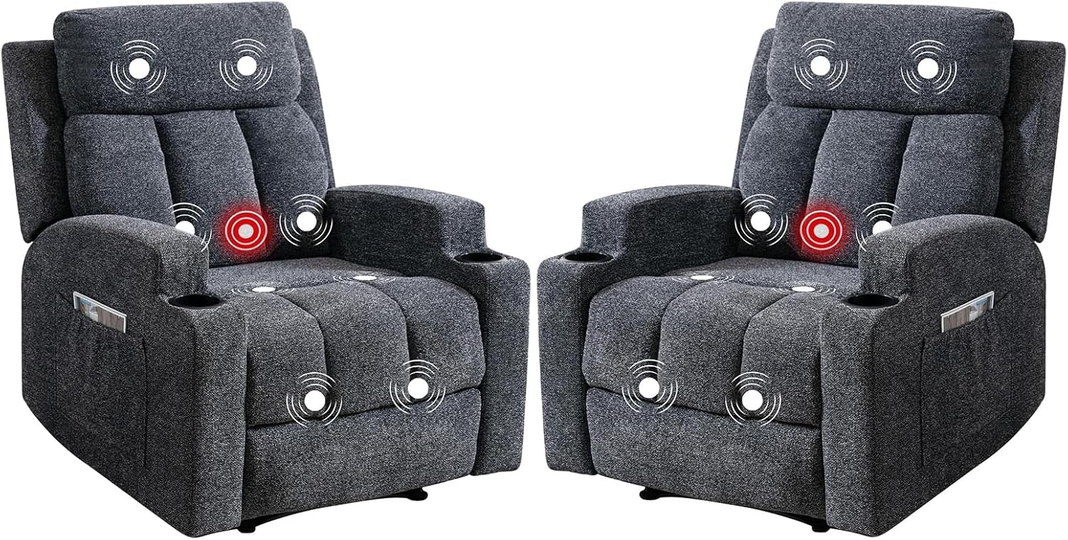 Phoenix Home Manual Recliner Chair Set of 2 with Massage and Heat, Ergonomic Overstuffed Breathable Fabric Recliner Single Sofa with 2 Cup Holders, Living Room Lounge Recliners on Clearance, Dark Gray