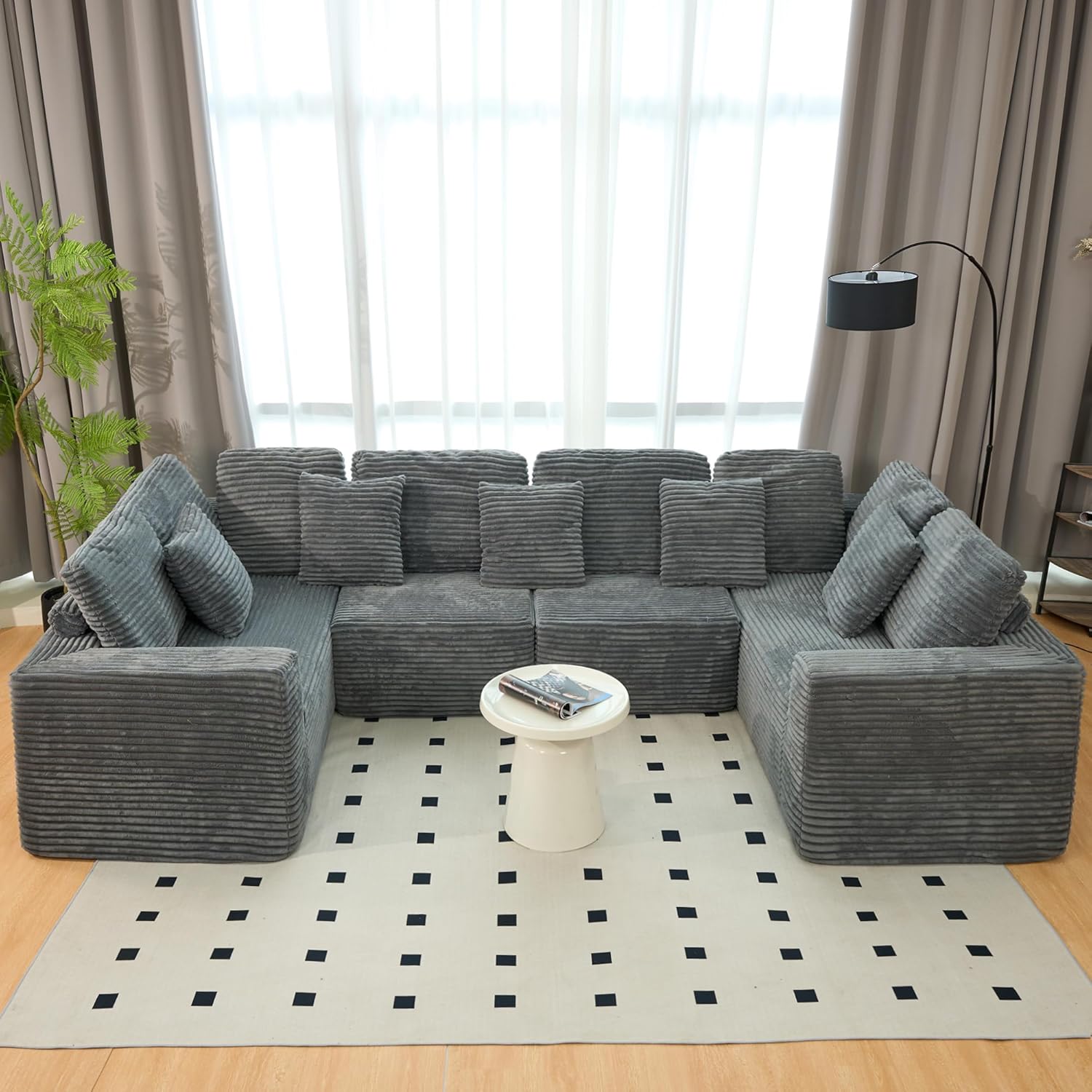 KEIKI 135" U Shape Sectional Sofa,6-Seater Modular Couch with Striped Corduroy Fabric for Living Room,Customizable Design