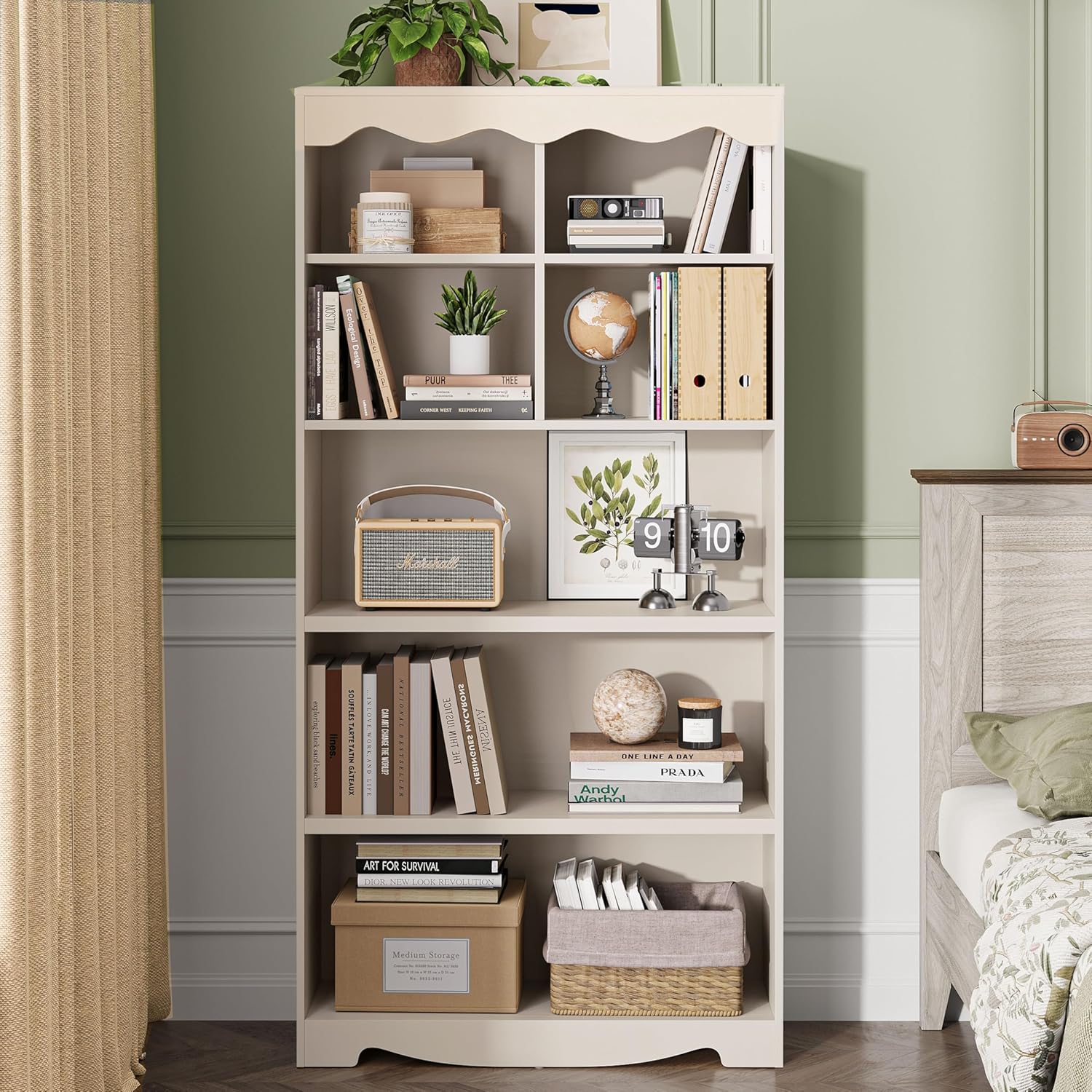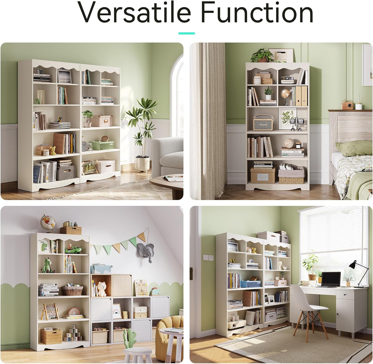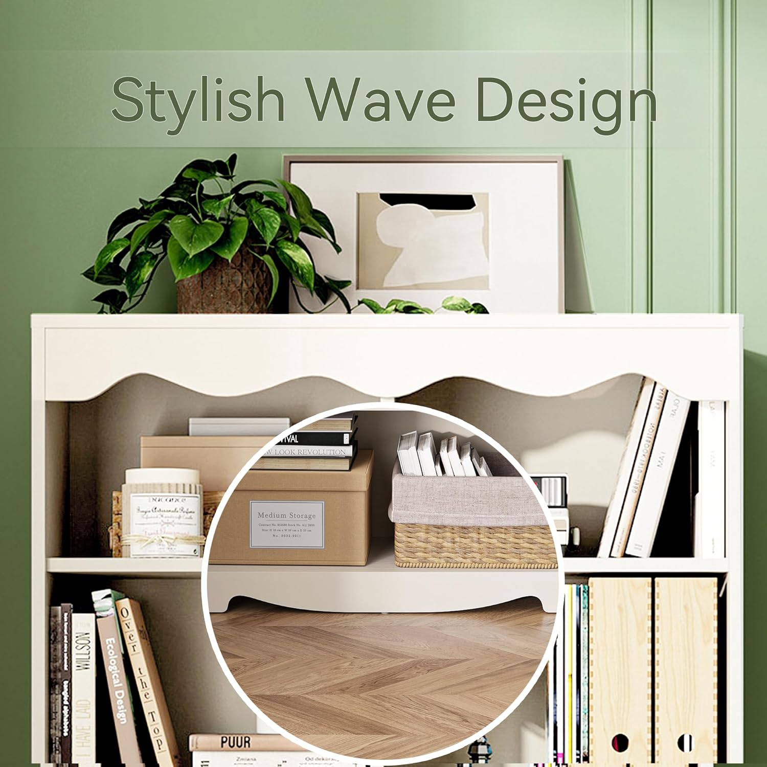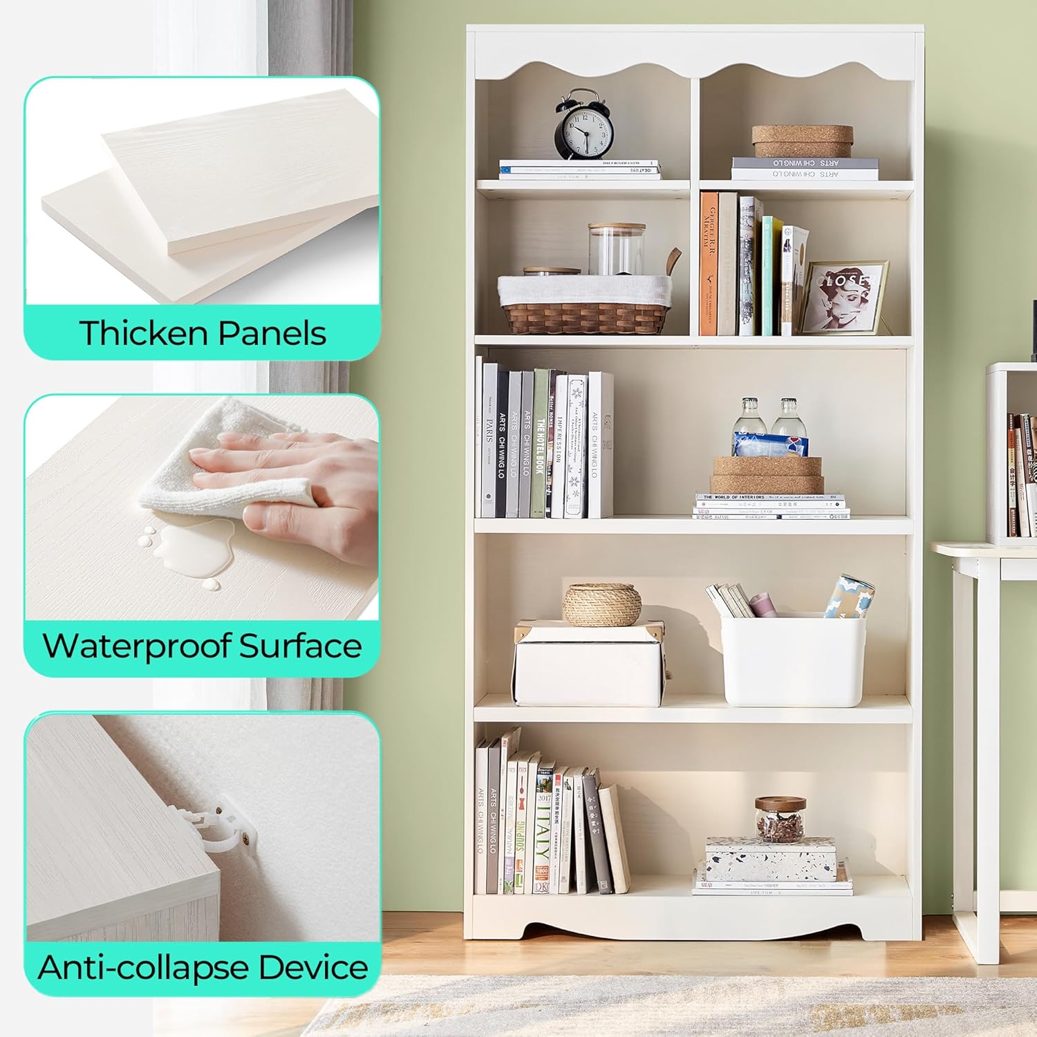 - Modern Style: With smooth lines and a natural wood grain finish, 5 tier bookcase features wave-like edges that add design details. Its neutral tones and simple design allow it to blend seamlessly with any home decor style, combining functionality with aesthetic appeal for a striking visual effect