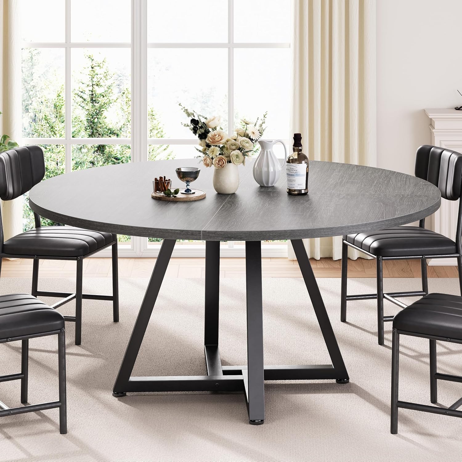 Round Kitchen Dining Room Table Circle Dining Dinner Table with Pedestal Metal Frame, Space Saving Wood Industrial Furniture for Small Space (Grey, 47IN)